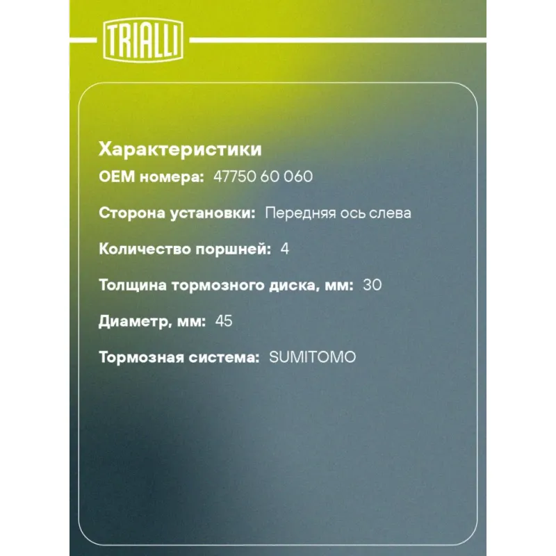 Суппорт тормозной для автомобилей Toyota Land Cruiser 80 (89-) передний левый d=45мм Характеристики: Артикул: CF 800307 OEM номера: 47750 60 060 Тормозная система: SUMITOMO Диаметр, мм: 45 Гарантийный срок: 2 года / 60 000 км Количество поршней: 4 Толщина тормозного диска, мм: 30 Сторона установки: Передняя ось слева Сопутствующий товар: Ремкомплект суппорта: RCF 800307 Сопутствующий товар: Поршень суппорта: RCF 800308 Сопутствующий товар: Скоба суппорта: CF 800309 Сопутствующий товар: Суппорт тормозной: CF 800308 Парный товар: CF 800308 Количество на автомобиль: 1 Товарная линейка: BLACK Комплектация: Скоба дискового тормозного механизма (суппорт тормозной без направляющей колодок) - 1 шт Гарантия: от 1 года.