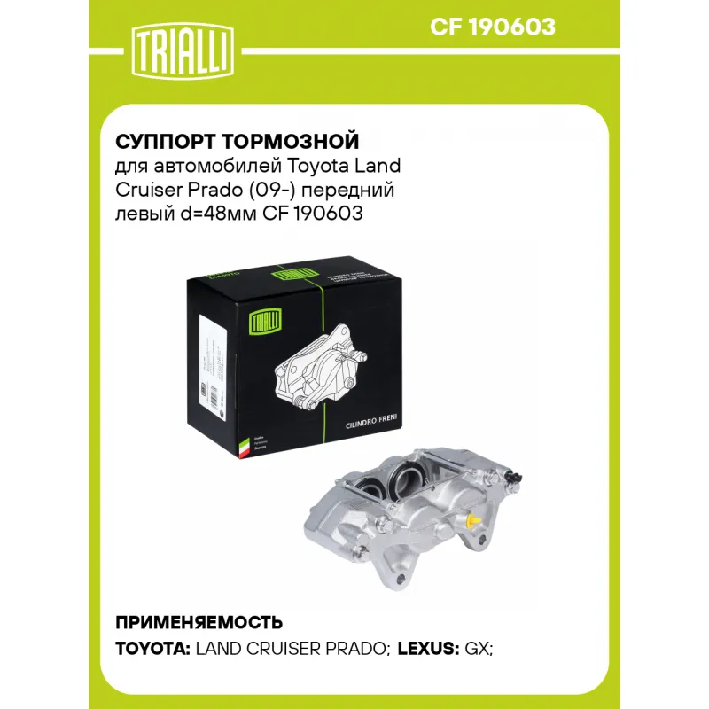 Суппорт тормозной для автомобилей Toyota Land Cruiser Prado (09-) передний левый d=48мм Характеристики: Артикул: CF 190603 OEM номера: 47750-60300 Сопутствующий товар: Ремкомплект суппорта: RCF 190603 Сопутствующий товар: Поршень суппорта: RCF 190604 Сопутствующий товар: Суппорт тормозной: CF 190604 Парный товар: CF 190604 Количество на автомобиль: 1 Диаметр, мм: 48 Количество поршней: 4 Гарантийный срок: 2 года / 60 000 км Толщина тормозного диска, мм: 32 Тормозная система: SUMITOMO Сторона установки: Передняя ось слева Товарная линейка: BLACK Комплектация: Скоба дискового тормозного механизма (суппорт тормозной без направляющей колодок) - 1 шт Гарантия: от 1 года.