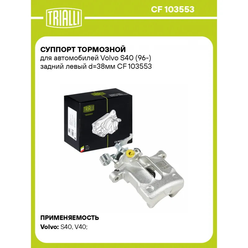 Суппорт тормозной для автомобилей Volvo S40 (96-) задний левый d=38мм Характеристики: Артикул: CF 103553 OEM номера: 8601977, 8251698, MR 955245 Сопутствующий товар: Ремкомплект суппорта: RCF 103553 Сопутствующий товар: Поршень суппорта: RCF 103554 Сопутствующий товар: Скоба суппорта: CF 012013 Сопутствующий товар: Суппорт тормозной: CF 103554 Парный товар: CF 103554 Количество на автомобиль: 1 Диаметр, мм: 38 Количество поршней: 1 Гарантийный срок: 2 года / 60 000 км Толщина тормозного диска, мм: 10 Тормозная система: TRW Сторона установки: Задняя ось слева Товарная линейка: BLACK Подходит для авто: Volvo S40 (96-), V40 (95-) Для проверки применяемости отправьте VIN автомобиля через вкладку "Есть вопросы о товаре?" Комплектация: Скоба дискового тормозного механизма (суппорт тормозной без направляющей колодок) - 1 шт Гарантия: от 1 года.