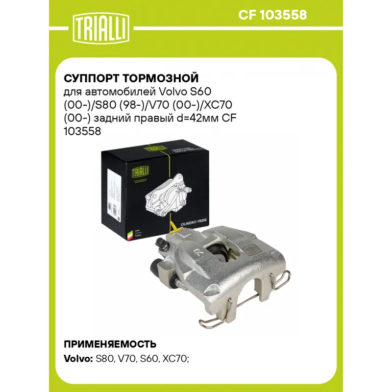 Суппорт тормозной для автомобилей Volvo S60 (00-)/S80 (98-)/V70 (00-)/XC70 (00-) задний правый d=42мм Характеристики: Артикул: CF 103558 OEM номера: 36000730, 8601561 Сопутствующий товар: Ремкомплект суппорта: RCF 103557 Сопутствующий товар: Поршень суппорта: RCF 103558 Сопутствующий товар: Суппорт тормозной: CF 103557 Парный товар: CF 103557 Количество на автомобиль: 1 Диаметр, мм: 42 Количество поршней: 1 Гарантийный срок: 2 года / 60 000 км Толщина тормозного диска, мм: 12 Тормозная система: ATE Сторона установки: Задняя ось справа Товарная линейка: BLACK Подходит для авто: Volvo S80 (98-), V70 (00-), S60 (00-), XC70 (97-), S80 (98-) Для проверки применяемости отправьте VIN автомобиля через вкладку "Есть вопросы о товаре?" Комплектация: Скоба дискового тормозного механизма (суппорт тормозной без направляющей колодок) - 1 шт Гарантия: от 1 года.