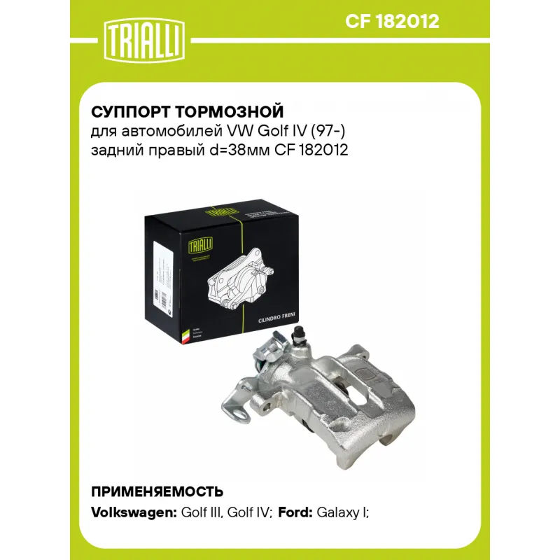 Суппорт тормозной для автомобилей VW Golf IV (97-) задний правый d=38мм Характеристики: Артикул: CF 182012 OEM номера: 1001959, 1H0 615 424 A, 1H0 615 424 B Сопутствующий товар: Ремкомплект суппорта: RCF 182011 Сопутствующий товар: Поршень суппорта: RCF 182012 Сопутствующий товар: Суппорт тормозной: CF 182011 Парный товар: CF 182011 Количество на автомобиль: 1 Диаметр, мм: 38 Количество поршней: 1 Гарантийный срок: 2 года / 60 000 км Толщина тормозного диска, мм: 10 Тормозная система: TRW Сторона установки: Задняя ось справа Товарная линейка: BLACK Подходит для авто: Volkswagen Golf III (91-), Golf IV (97-), Golf IV (97-) Ford Galaxy I (95-) Для проверки применяемости отправьте VIN автомобиля через вкладку "Есть вопросы о товаре?" Комплектация: Скоба дискового тормозного механизма (суппорт тормозной без направляющей колодок) - 1 шт Гарантия: от 1 года.