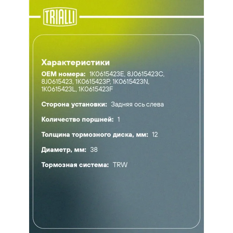 Суппорт тормозной для автомобилей VW Golf VI (08-)/Audi A3 (03-) задний левый d=38мм Характеристики: Артикул: CF 182559 OEM номера: 1K0615423E, 8J0615423C, 8J0615423, 1K0615423P, 1K0615423N, 1K0615423L, 1K0615423F Сопутствующий товар: Ремкомплект суппорта: RCF 182559 Сопутствующий товар: Поршень суппорта: RCF 182560 Сопутствующий товар: Суппорт тормозной: CF 182560 Диаметр тормозного диска, мм: 282 Парный товар: CF 182560 Количество на автомобиль: 1 Диаметр, мм: 38 Количество поршней: 1 Гарантийный срок: 2 года / 60 000 км Толщина тормозного диска, мм: 12 Тормозная система: TRW Сторона установки: Задняя ось слева Товарная линейка: BLACK Подходит для авто: Audi A3 (03-), A3 (03-) Volkswagen Golf V (03-), Golf VI (08-), Jetta (05-), Golf V (03-), Golf VI (08-), Jetta (05-) Для проверки применяемости отправьте VIN автомобиля через вкладку "Есть вопросы о товаре?" Комплектация: Скоба дискового тормозного механизма (суппорт тормозной без направляющей колодок) - 1 шт Гарантия: от 1 года.