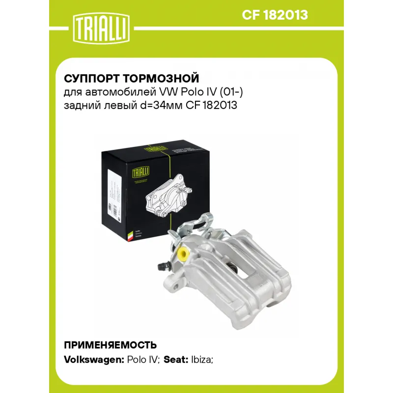 Суппорт тормозной для автомобилей VW Polo IV (01-) задний левый d=34мм Характеристики: Артикул: CF 182013 OEM номера: 6Q0615423A, 6Q0615423B Сопутствующий товар: Ремкомплект суппорта: RCF 182013 Сопутствующий товар: Поршень суппорта: RCF 182014 Сопутствующий товар: Скоба суппорта: CF 012014 Сопутствующий товар: Суппорт тормозной: CF 182014 Парный товар: CF 182014 Количество на автомобиль: 1 Диаметр, мм: 34 Количество поршней: 1 Гарантийный срок: 2 года / 60 000 км Толщина тормозного диска, мм: 9 Тормозная система: TRW Сторона установки: Задняя ось слева Товарная линейка: BLACK Подходит для авто: Volkswagen Polo IV (01-), Polo IV (01-) Seat Ibiza (00-), Ibiza (00-) Для проверки применяемости отправьте VIN автомобиля через вкладку "Есть вопросы о товаре?" Комплектация: Скоба дискового тормозного механизма (суппорт тормозной без направляющей колодок) - 1 шт Гарантия: от 1 года.