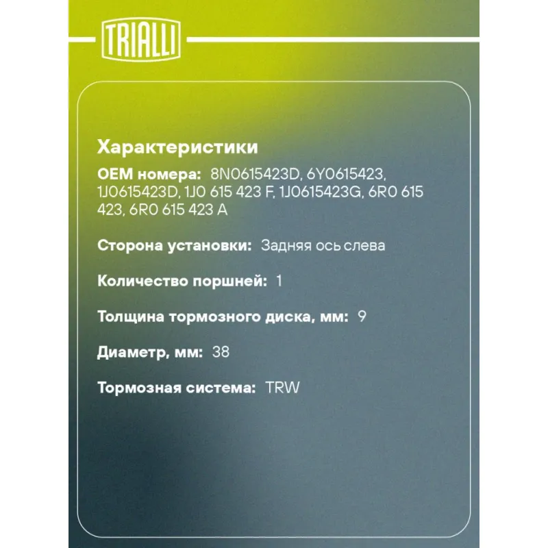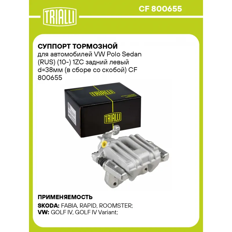 Суппорт тормозной для автомобилей VW Polo Sedan (RUS) (10-) 1ZC задний левый d=38мм (в сборе со скобой) Характеристики: Артикул: CF 800655 OEM номера: 8N0615423D, 6Y0615423, 1J0615423D, 1J0 615 423 F, 1J0615423G, 6R0 615 423, 6R0 615 423 A Сопутствующий товар: Ремкомплект суппорта: RCF 182063 Сопутствующий товар: Поршень суппорта: RCF 182064 Сопутствующий товар: Скоба суппорта: CF 190617 Парный товар: CF 800656 Количество на автомобиль: 1 Диаметр, мм: 38 Количество поршней: 1 Гарантийный срок: 2 года / 60 000 км Толщина тормозного диска, мм: 9 Тормозная система: TRW Сторона установки: Задняя ось слева Товарная линейка: BLACK Комплектация: Скоба дискового тормозного механизма (суппорт тормозной в сборе с направляющей колодок) - 1 шт Гарантия: от 1 года.