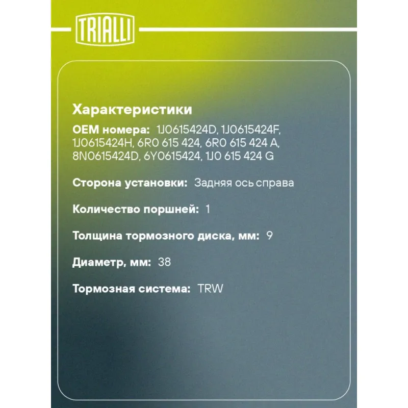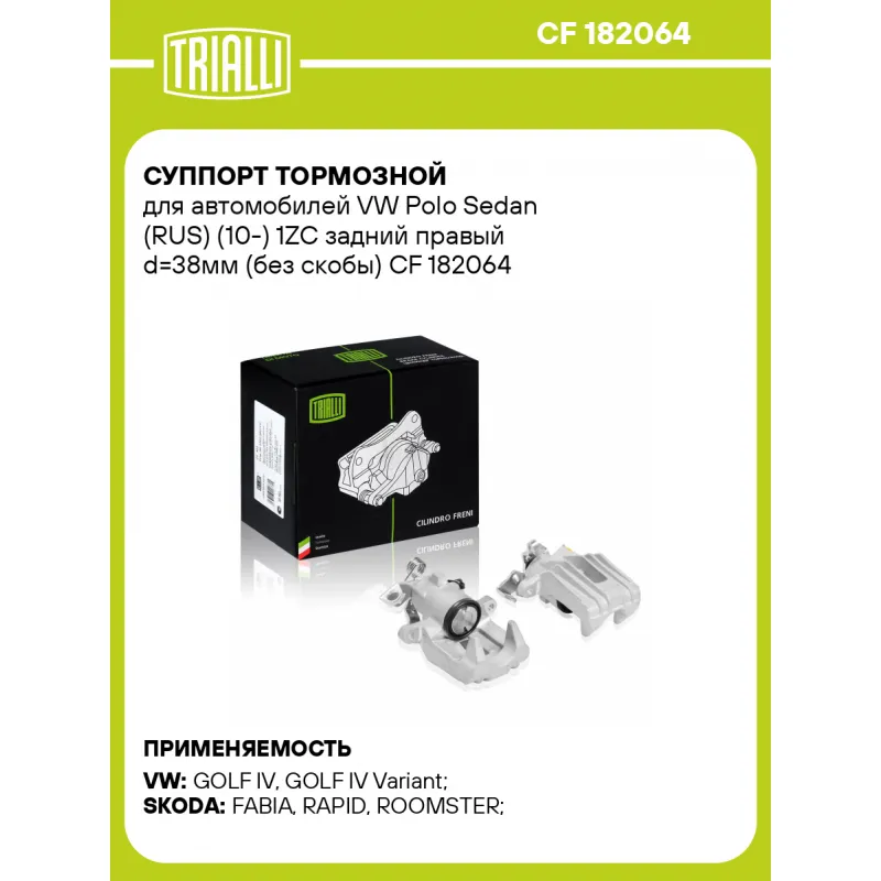 Суппорт тормозной для автомобилей VW Polo Sedan (RUS) (10-) 1ZC задний правый d=38мм (без скобы) Характеристики: Артикул: CF 182064 OEM номера: 1J0615424D, 1J0615424F, 1J0615424H, 6R0 615 424, 6R0 615 424 A, 8N0615424D, 6Y0615424, 1J0 615 424 G Сопутствующий товар: Ремкомплект суппорта: RCF 182063 Сопутствующий товар: Поршень суппорта: RCF 182064 Сопутствующий товар: Скоба суппорта: CF 190617 Сопутствующий товар: Суппорт тормозной: CF 182063 Парный товар: CF 182063 Количество на автомобиль: 1 Диаметр, мм: 38 Количество поршней: 1 Гарантийный срок: 2 года / 60 000 км Толщина тормозного диска, мм: 9 Тормозная система: TRW Сторона установки: Задняя ось справа Товарная линейка: BLACK Комплектация: Скоба дискового тормозного механизма (суппорт тормозной без направляющей колодок) - 1 шт Гарантия: от 1 года.