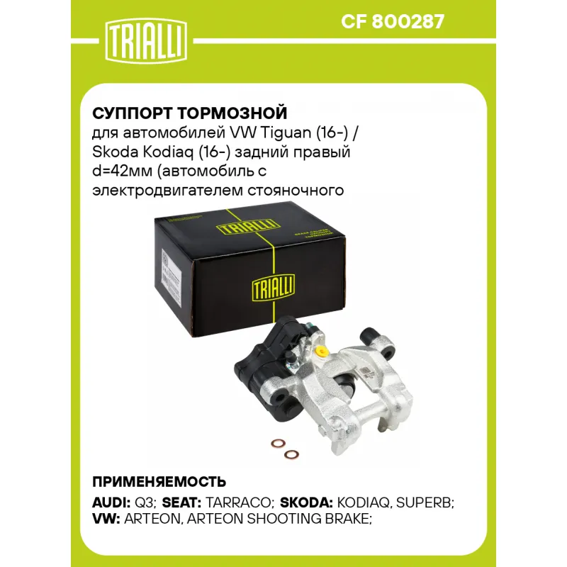 Суппорт тормозной для автомобилей VW Tiguan (16-) / Skoda Kodiaq (16-) задний правый d=42мм (автомобиль с электродвигателем стояночного тормоза) (диск 12мм) Характеристики: Артикул: CF 800287 OEM номера: 3Q0 615 424, 3Q0 615 424 X Особенности конструкции:: Для автомобилей с электрическим стояночным тормозом Тормозная система: ATE Диаметр, мм: 42 Гарантийный срок: 2 года / 60 000 км Количество поршней: 1 Толщина тормозного диска, мм: 12 Сторона установки: Задняя ось справа Сопутствующий товар: Ремкомплект суппорта: RCF 800286 Сопутствующий товар: Поршень суппорта: RCF 800287 Сопутствующий товар: Скоба суппорта: CF 800288 Сопутствующий товар: Электродвигатель суппорта: RCM 800288 Сопутствующий товар: Суппорт тормозной: CF 800286 Парный товар: CF 800286 Количество на автомобиль: 1 Товарная линейка: BLACK Комплектация: Скоба дискового тормозного механизма (суппорт тормозной без направляющей колодок) - 1 шт Гарантия: от 1 года.