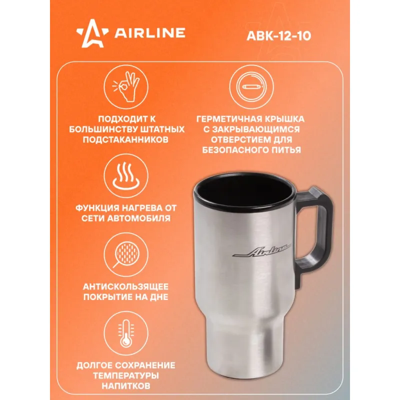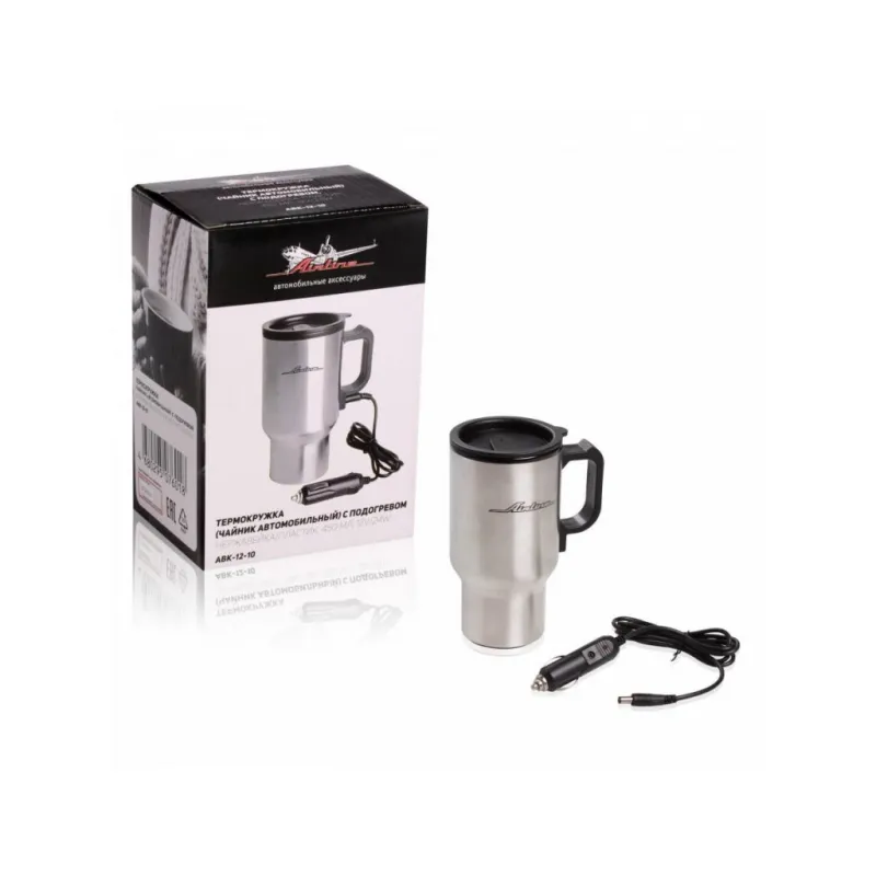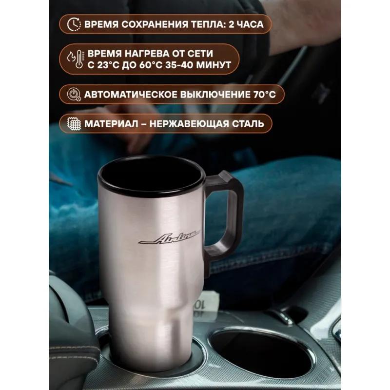 Термокружка (чайник автомобильный) с подогревом, нержавейка/пластик, 450 мл, 12V, 24W Описание: Применяется для продолжительного сохранения температуры напитков и их подогрева от бортовой сети автомобиля. Кружка имеет двойные стенки, внутренняя сделана из пищевого пластика, а наружная из нержавеющей стали. Крышка кружки герметична и оснащена отрывающимся окошком-поилкой, позволяющим безопасно пить во время движения. Характеристики: Артикул: ABK-12-10 Мощность, Вт: 24 Цвет: серебристый Напряжение питания, В: 12 Длина провода, м: 1,45 Материал колбы: металл Максимальная температура нагрева, С: 70 Время нагрева с 23С до 60С, мин: 35 Тип термоса: вакуумный Автоматическое выключение: да Комплектация: Термокружка - 1 шт Сетевой шнур - 1 шт Гарантия: от 1 года.