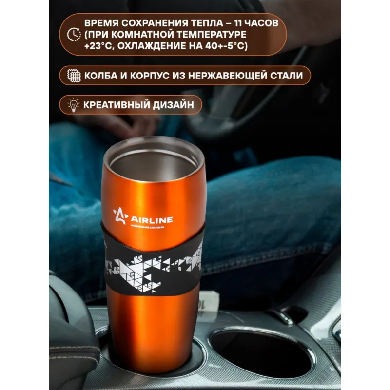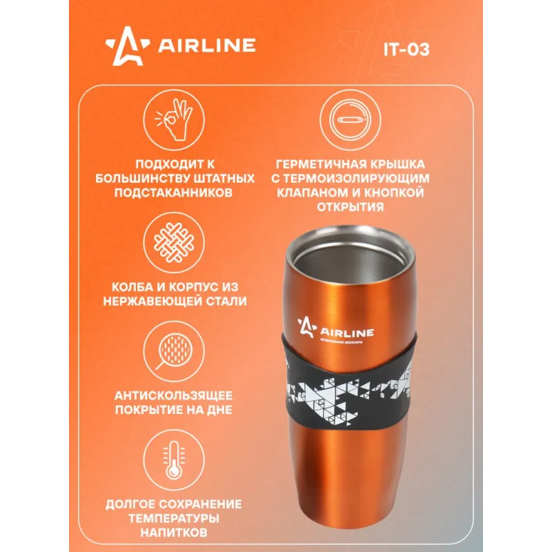 Термокружка с клапаном, 380 мл., оранжевая Описание: Термокружка 0,38 л AIRLINE IT-03 - представляет собой ёмкость из нержавеющей стали с двойными стенками и герметичной пластиковой крышкой с системой (клапаном) быстрого открывания. Термокружки оснащены по центру резиновым настаканником/держателем для предотвращения их выскальзывания из рук. Время сохранения тепла-11 часов (при комнатной температуре +23С, охлаждение на 40+-5С) Преимущества: *Нержавеющая сталь; *Резиновый настаканник от выскальзывания; *Объем – 0,38 л; *Легко открывать и закрывать одной рукой; *Стильный дизайн. Мужская и женская термокружка; *Идеальна для автомобиля в подстаканник. Рекомендации: 1. Перед заполнением термокружки ополоснуть ее внутри теплой водой и отдельно смочить крышку. 2. С целью исключения повреждения не рекомендуется внутреннюю поверхность сосудов чистить щетками или различными порошками. 3. После использования необходимо тщательно вымыть термос, а после, не закрывая, поставить сушиться. Внимание: Запрещается мыть изделие в посудомоечной машине. Не кипятите крышки. Храните и перемещайте изделие в вертикальном положении. Не разогревайте в микроволновке. Термокружка с функцией сохранения тепла повысит уровень комфорта во время путешествий, пикника и ежедневных поездок, его можно брать в школу и на работу, поэтому станет нужным полезным подарком автомобилисту, мужу, папе, бату, дяде, жене, маме, сестре, тете, коллеге, ребенку. Этот термокружка для напитков - это универсальный подарок на любой праздник. Характеристики: Артикул: IT-03 Объем, л: 0,38 Время сохранения тепла, ч: 11 Цвет: оранжевый Материал колбы: металл Тип термоса: вакуумный Комплектация: Термокружка - 1 шт Коробка - 1 шт Гарантия: от 1 года.