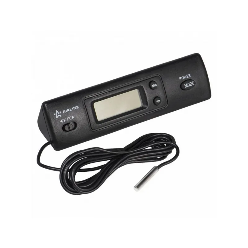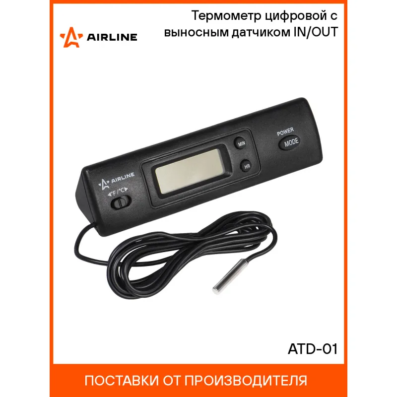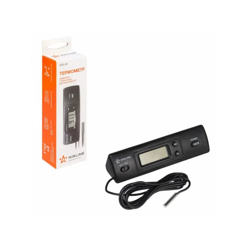 Термометр цифровой с выносным датчиком IN/OUT Описание: Представляет собой измерительный прибор температуры воздуха с внешим и внутреним датчиками. Выполнен в ппластиковом корпусе и оснащен ЖК дисплеем. Питание происходит от 1.5V батарейки. Термометр измеряет температуру воздуха внутри и с наружи автомобиля, гаража, дома или квартиры. Термометр AIRLINE послужит нужным дополнением к автомобилям не имеющих функцию измерения температуры воздуха. Характеристики: Артикул: ATD-01 Температура измерения min, C: -50 Температура измерения max, C: +50 Информация на дисплеи: внешняя или внутренняя температура, время Длина, мм: 117 Ширина, мм: 30 Глубина, мм: 30 Длина провода внешнего датчика, м: 1,5 Крепление: двусторонний скотч, липучка Температура использования устройства, С: -10/+50 Температура монтажа, С: +5/+40 Комплектация: Термометр с датчиком - 1 шт Липучка с клеевым слоем - 1 шт Инструкция - 1 шт Коробка - 1 шт Гарантия: от 1 года.