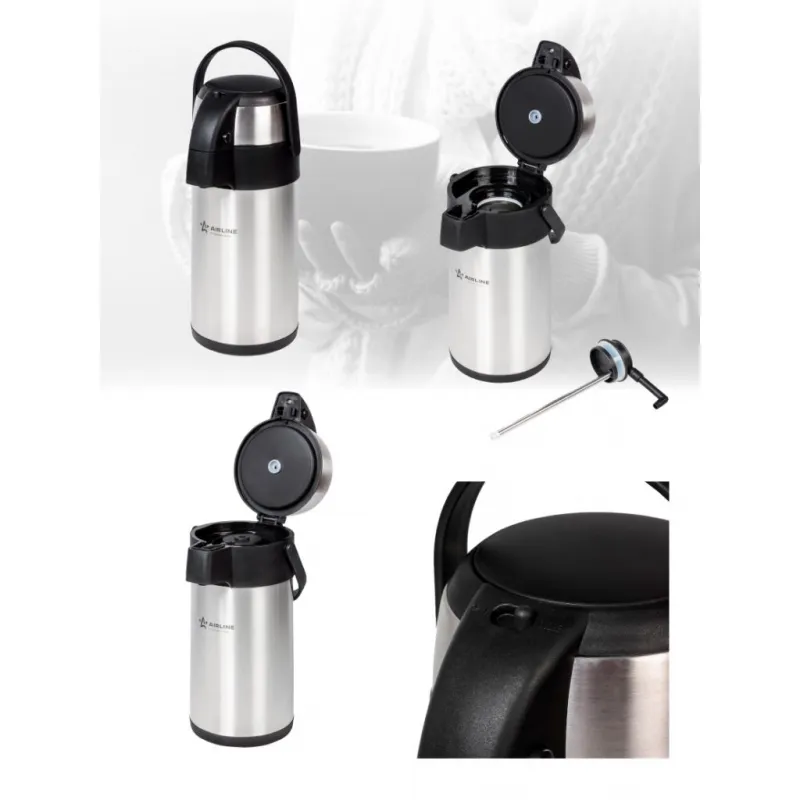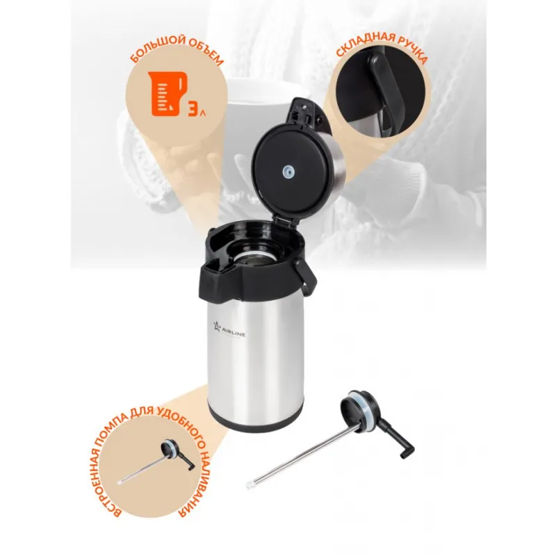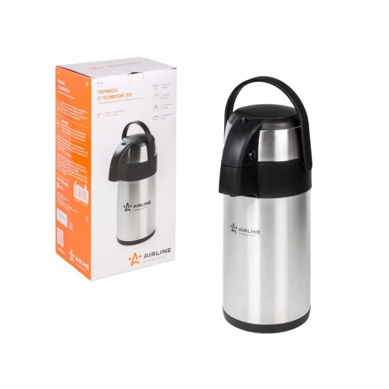 Термос с помпой 3,0 л., нержавеющая сталь (304), металлик Описание: Термос AIRLINE IT-16 - представляет собой 3 л ёмкость из 304 нержавеющей стали с двойными стенками и пластиковой крышкой. Термос оснащен помпой( насосом) для удобного наливания напитков путем нажатия на клавишу. Термос будет полезен в домашнем быту и незаменим для дальних поездок. Термосы так же оснащен удобной складной ручкой для переноски. Время сохранения тепла 20 часов, охлаждение на 40С +_5С, при комнатной температуре 23С Время сохранения холода 20 часов, нагрев на 4С +_2 С, при комнатной температуре 23С. Преимущества: *Большой объем; *Складная ручка; *Встроенная помпа для удобного наливания; *Долгое сохранение температуры; Рекомендации: 1. Перед заполнением термос ополоснуть ее внутри теплой водой и отдельно смочить крышку. 2. С целью исключения повреждения не рекомендуется внутреннюю поверхность сосудов чистить щетками или различными порошками. 3. После использования необходимо тщательно вымыть термос, а после, не закрывая, поставить сушиться. Внимание: Запрещается мыть изделие в посудомоечной машине. Не кипятите крышки. Храните и перемещайте изделие в вертикальном положении. Не разогревайте в микроволновке. Термос с функцией сохранения тепла повысит уровень комфорта во время путешествий, пикника и ежедневных поездок, его можно брать в школу и на работу, поэтому станет нужным полезным подарком автомобилисту, мужу, папе, бату, дяде, жене, маме, сестре, тете, коллеге, ребенку. Этот термос для кофе, для чая, для напитков - это универсальный подарок на любой праздник. Характеристики: Артикул: IT-16 Объем, л: 3 Время сохранения тепла, ч: 20 Цвет: металлик Материал колбы: металл Тип термоса: вакуумный Комплектация: термос - 1 шт Коробка - 1 шт Гарантия: от 1 года.