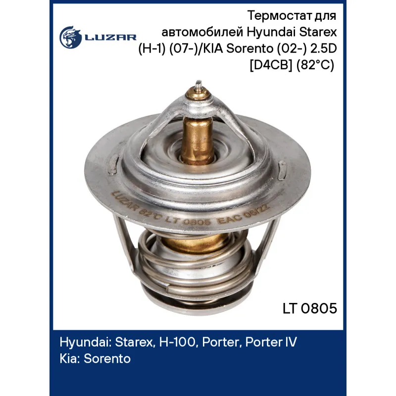 Термостат для автомобилей Hyundai Starex (H-1) (07-)/KIA Sorento (02-) 2.5D [D4CB] (82°С) (термоэл.) Характеристики: Артикул: LT 0805 OEM номера: 2551042010, 255104A700, 2551042850, 2551042000, 2551042541 Количество на автомобиль: 1 Трансмиссия: MT/AT Температура открытия, ?С: 82 Кондиционер: +/- Двигатель: [D4CB;D4BA] Подходит для авто: Hyundai Starex (H-1) (07-), Starex (H-1) (96-), H-100 (93-), Porter (H-100/TagAZ) (96-), Porter IV (H-100) (04-) Kia Sorento (02-), Sorento (06-) Для проверки применяемости отправьте VIN автомобиля через вкладку "Есть вопросы о товаре?" Комплектация: термостат - 1 шт Паспорт изделия - 1 шт Гарантия: от 1 года.