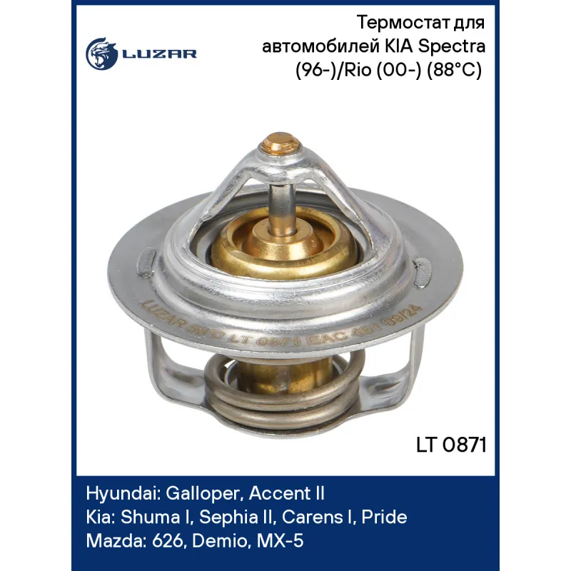 Термостат для автомобилей KIA Spectra (96-)/Rio (00-) (88°С) (термоэлемент) Характеристики: Артикул: LT 0871 OEM номера: 0K30E15171, 0K2C015171A, 0K20115171A, BP6F15171A, 19300PB2023, MD 997461, 0K2C015171, 0K01C1517YA, 2550033060, 0K01315171, 2550033050, 0K20115171, MD972903 Количество на автомобиль: 1 Трансмиссия: MT/AT Температура открытия, ?С: 88 Кондиционер: +/- Сопутствующий товар: Насосы водяные (помпы): LWP 08200; LWP 08650 Сопутствующий товар: Радиаторы охлаждения: LRc 0812; LRc 08122; LRc 081FB; LRc 08FA; LRc KIRi05110; LRc KIRi05200; LRc KISp962F2; LRc KISp963A2 Основной клапан: обрезиненный Подходит для авто: Hyundai Galloper (98-), Accent II (99-) Kia Shuma I (97-), Sephia II (97-), Sephia II (97-), Carens I (99-), Pride (87-), Sportage I (93-), Rio I (00-), Spectra (00-) Mazda 626 (87-), Demio (96-), MX-5 (98-) Honda Accord (78-), Prelude (83-) Mitsubishi Colt (96-), Lancer (96-), Galant (87-), Pajero II (90-) Для проверки применяемости отправьте VIN автомобиля через вкладку "Есть вопросы о товаре?" Комплектация: термостат - 1 шт Паспорт изделия - 1 шт Гарантия: от 1 года.