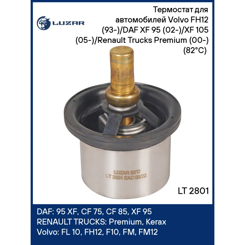 Термостат для автомобилей Volvo FH12 (93-)/DAF XF 95 (02-)/XF 105 (05-)/Renault Trucks Premium (00-) (82°С) (термоэлемент) Характеристики: Артикул: LT 2801 OEM номера: 1303061, 8149182, 5001855520, 1439844, 1684900, 7408149182, 1 544 683, 1 676 306, 4930594 Количество на автомобиль: 1 Трансмиссия: MT Температура открытия, ?С: 82 Кондиционер: +/- Подходит для авто: DAF 95 XF (97-), CF 75 (01-), CF 85 (01-), XF 95 (02-) RENAULT TRUCKS Premium (00-), Kerax (01-) Volvo FL 10 (95-), FH12 (02-), FH12 (93-), F10 (90-), FH12 (05-), FM (05-), FM12 (98-) Для проверки применяемости отправьте VIN автомобиля через вкладку "Есть вопросы о товаре?" Комплектация: термостат - 1 шт Паспорт изделия - 1 шт Гарантия: от 1 года.