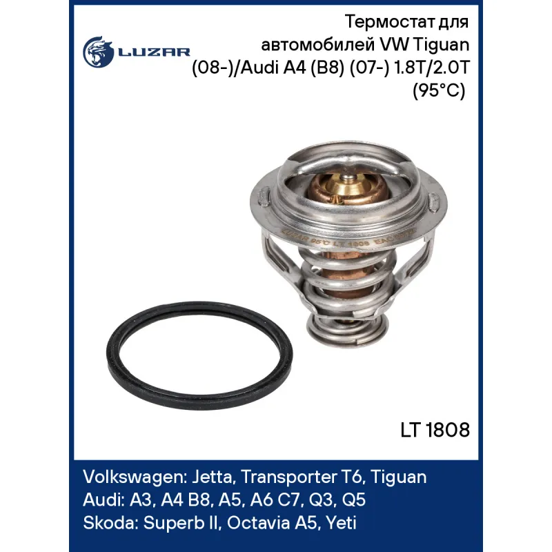 Термостат для автомобилей VW Tiguan (08-)/Audi A4 (B8) (07-) 1.8T/2.0T (95°С) (термоэлемент) Характеристики: Артикул: LT 1808 OEM номера: 06J121113C, 06J121113, 06J121113A Количество на автомобиль: 1 Трансмиссия: MT/AT Температура открытия, ?С: 95 Кондиционер: + Сопутствующий товар: Насосы водяные (помпы): LWP 1836, LWP 18H6 Комплектация: уплотнительная прокладка Ограничение производителя: BEHR Подходит для авто: Volkswagen Jetta (11-), Transporter T6 (15-), Tiguan (08-), Transporter T5 (03-), Passat B6 (05-), Golf VI (08-) Audi A3 (07-), A4 B8 (07-), A5 (07-), A6 C7 (11-), Q3 (11-), Q5 (08-) Skoda Superb II (08-), Octavia A5 (04-), Yeti (09-), Octavia A5 (04-) Для проверки применяемости отправьте VIN автомобиля через вкладку "Есть вопросы о товаре?" Комплектация: термостат - 1 шт Паспорт изделия - 1 шт Уплотнительная прокладка - 1 шт Гарантия: от 1 года.