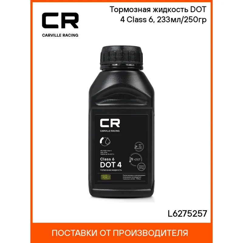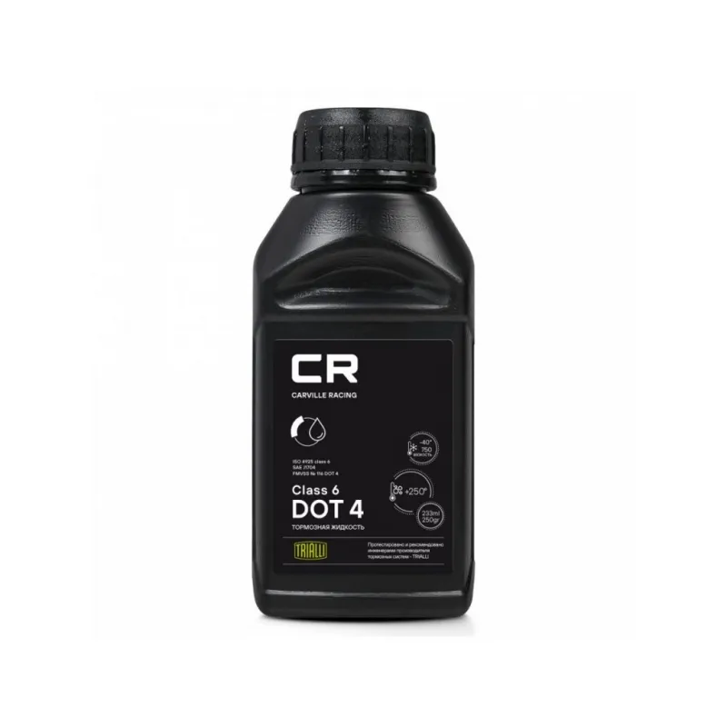 | Инструкция по применению | Тормозная жидкость Carville Racing DOT 4 предназначена для использования во всех гидравлических тормозных системах и приводах сцеплений, в которых рекомендовано применение жидкостей DOT 3 и DOT 4. Рекомендуемый срок замены – каждые 2 года либо 40000 км пробега. Необходимо соблюдать предписанные производителем транспортного средства интервалы замены тормозной жидкости. Необходимо соблюдать предписания производителя транспортного средства по спецификации тормозной жидкости. ВНИМАНИЕ! Тормозная жидкость агрессивна по отношению к лакам, краскам и коже рук. |
