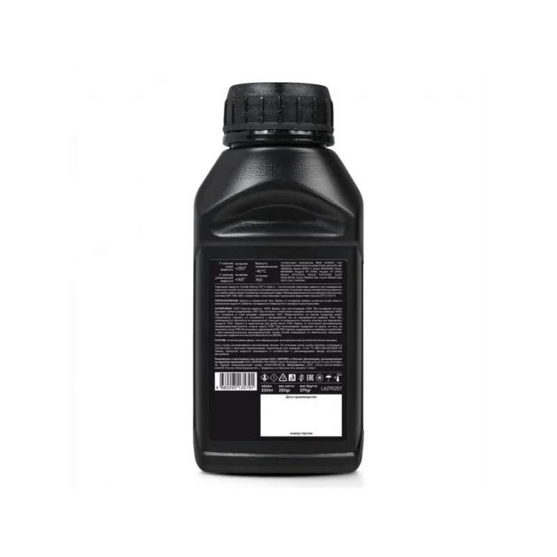 Тормозная жидкость DOT 4 Class 6, 233мл/250гр Описание: Синтетическая тормозная жидкость, созданная специально для обеспечения быстроты и надёжности работы электронных систем управления устойчивостью автомобиля ESP, ABS или ASR. Благодаря низкой кинематической вязкости тормозная жидкость гораздо быстрее приводит в действие тормозную систему и обеспечивает быстрый отклик тормозов, особенно в условиях сильных заморозков. Обладает высокой температурой кипения увлажненной жидкости не ниже +165°С для поддержания эффективности торможения при сильном разогреве компонентов тормозной системы. Характеристики: Артикул: L6275257 OEM номера: 1847947, A000989080713, 83132405977, 93746642, 83130443026, 1942421, 32214958, 31400204, A000989080718, 1847945, 1847946, 1847948, B000750M1 Состав: Состав: полигликолевые эфиры, пластифицирующая, антикоррозионная, антиокислительная присадки. Срок эксплуатации: Срок эксплуатации устанавливается изготовителем техники. Гарантийный срок хранения: 5 лет Соответствие требованиям/стандартам: ISO 4925 class 6; SAE J1704; FMVSS № 116 DOT4 Спецификации: BMW QV34001, Ford M6C65A1, Ford M6C65A2, Ford M6C9103A, GM 16072, GM GMW3356, Mazda MN120 C, Nissan M5055NR3, Nissan M5055NR4, Peugeot S71 2114(4), Peugeot S71 2114(6), Renault 41.02.001(3), Renault 41.02.001(4), Suzuki 59100-510XD, Toyota TSK2602 G(3), Toyota TSK2602 G(4), VW TL 766 Z, VW 50114, MB 331.0 Температура кипения сухой жидкости: не ниже 250 °С (типичное значение - 266 °С) Температура кипения увлажненной жидкости: не ниже 165 °С (типичное значение - 175 °С) Вязкость кинематическая при -40°С: не выше 750 мм2/с (типичное значение - 650 мм2/с) Совместимость: Тормозная жидкость Carville Racing DOT 4 class 6 совместима с качественными тормозными жидкостями на гликолевой основе (DOT 3, DOT 4 и DOT 5.1 без силикона). Однако, для сохранения эксплуатационных характеристик тормозных жидкостей Carville Racing не рекомендуется смешивание с тормозными жидкостями других производителей. Не совместима с жидкостями на минеральной основе (LHM) и силиконовой основе (DOT 5). Объём: 233 мл Комплектация: Тормозная жидкость - 1 шт Гарантия: от 1 года.