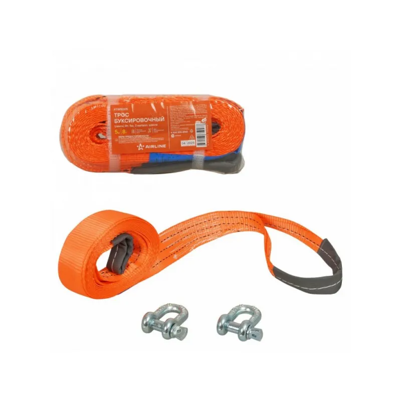 Трос буксировочный (лента) 8 т, 5 м, 2 металл. шакла Описание: Буксировочный трос AIRLINE 8 тонн 5 метров с шаклами — это идеальный выбор для тех, кто ищет надежность и дополнительную прочность при буксировке автомобилей. Шаклы обеспечивают надежное и безопасное соединение троса с транспортируемым автомобилем, что особенно важно при интенсивных нагрузках. Изготовленный из высокопрочной полиэфирной нити, этот трос гарантирует отличную прочность, он устойчивость к воздействию влаги, ультрафиолетового излучению и морозу. Легко сматываемый в компактный рулон, этот трос удобно хранить в багажнике, он не занимает лишнего места, и отлично подходит для использования в любых климатических условиях. Характеристики: Артикул: ATWS005 Крепление: Металлические шаклы Ширина ленты, мм: 50 Загиб на петлю, см: 30 Длина ленты, м: 5 Материал ленты: Полиэфир Длина сшивки, см: 15 Кол-во строчек, шт: 9 Линейная плотность, г/м: 68 Нагрузка, т: 8 Тип шакла: Прямой Нагрузка на разрыв шакла, т: 8 Комплектация: Металлический шакл - 2 шт Трос буксировочный - 1 шт Гарантия: от 1 года.