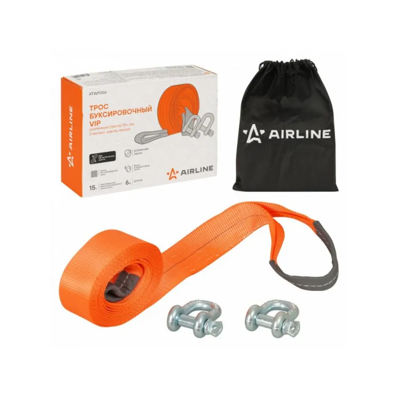 Трос VIP буксировочный усиленный (лента) 15 т, 6 м , 2 металл. шакла, с мешком Описание: Буксировочный трос AIRLINE в VIP линейке 15 тонн 6 метров с шаклами — для тех, кто ценит высший уровень надежности и долговечности при буксировке. Шаклы, использующиеся в этой модели, обеспечивают надежное и безопасное соединение с автомобилем, даже при высоких нагрузках. Трос выполнен из высококачественной полиэфирной нити, которая обладает исключительной прочностью и устойчивостью к воздействию влаги, ультрафиолетовых лучей и низких температур. В отличие от стандартных моделей, этот трос имеет более высокую разрывную нагрузку, что делает его идеальным для более интенсивных и требовательных условий эксплуатации. В комплект входит удобный мешок для хранения, который помогает компактно сложить трос и удобно разместить его в багажнике. Легко сматываемый в компактный рулон, он не занимает много места, предоставляя удобство в хранении и транспортировке. Характеристики: Артикул: ATWP006 Крепление: Металлические шаклы Ширина ленты, мм: 75 Загиб на петлю, см: 30 Длина ленты, м: 6 Материал ленты: Полиэфир Длина сшивки, см: 15 Кол-во строчек, шт: 9 Линейная плотность, г/м: 216 Нагрузка, т: 15 Тип шакла: Прямой Нагрузка на разрыв шакла, т: 19 Комплектация: Коробка картонная - 1 шт Металлический шакл - 2 шт Трос буксировочный с петлями - 1 шт Мешок - 1 шт Гарантия: от 1 года.