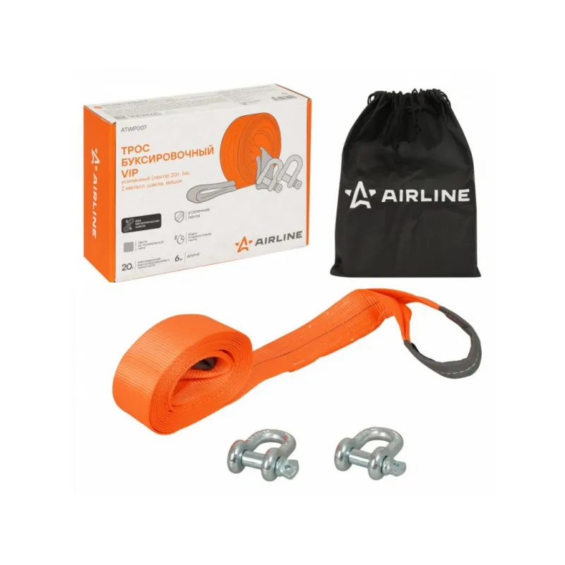 Трос VIP буксировочный усиленный (лента) 20 т, 6 м , 2 металл. шакла, с мешком Описание: Буксировочный трос AIRLINE в VIP линейке 20 тонн 6 метров с шаклами — для тех, кто ценит высший уровень надежности и долговечности при буксировке. Шаклы, использующиеся в этой модели, обеспечивают надежное и безопасное соединение с автомобилем, даже при высоких нагрузках. Трос выполнен из высококачественной полиэфирной нити, которая обладает исключительной прочностью и устойчивостью к воздействию влаги, ультрафиолетовых лучей и низких температур. В отличие от стандартных моделей, этот трос имеет более высокую разрывную нагрузку, что делает его идеальным для более интенсивных и требовательных условий эксплуатации. В комплект входит удобный мешок для хранения, который помогает компактно сложить трос и удобно разместить его в багажнике. Легко сматываемый в компактный рулон, он не занимает много места, предоставляя удобство в хранении и транспортировке. Характеристики: Артикул: ATWP007 Крепление: Металлические шаклы Ширина ленты, мм: 75 Загиб на петлю, см: 30 Длина ленты, м: 6 Материал ленты: Полиэфир Длина сшивки, см: 15 Кол-во строчек, шт: 9 Линейная плотность, г/м: 216 Нагрузка, т: 20 Тип шакла: Прямой Нагрузка на разрыв шакла, т: 19 Комплектация: Коробка картонная - 1 шт Металлический шакл - 2 шт Трос буксировочный с петлями - 1 шт Мешок - 1 шт Гарантия: от 1 года.