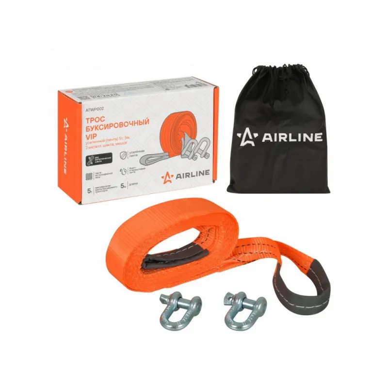 Трос VIP буксировочный усиленный (лента) 5 т, 5 м, 2 металл. шакла, с мешком Описание: Буксировочный трос AIRLINE в VIP линейке 5 тонн 5 метров с шаклами — для тех, кто ценит высший уровень надежности и долговечности при буксировке. Шаклы, использующиеся в этой модели, обеспечивают надежное и безопасное соединение с автомобилем, даже при высоких нагрузках. Трос выполнен из высококачественной полиэфирной нити, которая обладает исключительной прочностью и устойчивостью к воздействию влаги, ультрафиолетовых лучей и низких температур. В отличие от стандартных моделей, этот трос имеет более высокую разрывную нагрузку, что делает его идеальным для более интенсивных и требовательных условий эксплуатации. В комплект входит удобный мешок для хранения, который помогает компактно сложить трос и удобно разместить его в багажнике. Легко сматываемый в компактный рулон, он не занимает много места, предоставляя удобство в хранении и транспортировке. Характеристики: Артикул: ATWP002 Крепление: Металлические шаклы Ширина ленты, мм: 50 Загиб на петлю, см: 25 Длина ленты, м: 5 Материал ленты: Полиэфир Длина сшивки, см: 10 Кол-во строчек, шт: 9 Линейная плотность, г/м: 68 Нагрузка, т: 5 Тип шакла: Прямой Нагрузка на разрыв шакла, т: 8 Комплектация: Металлический шакл - 2 шт Трос буксировочный с петлями - 1 шт Мешок - 1 шт Коробка картонная - 1 шт Гарантия: от 1 года.