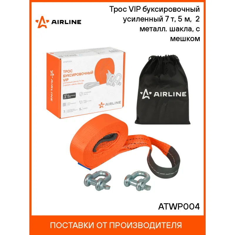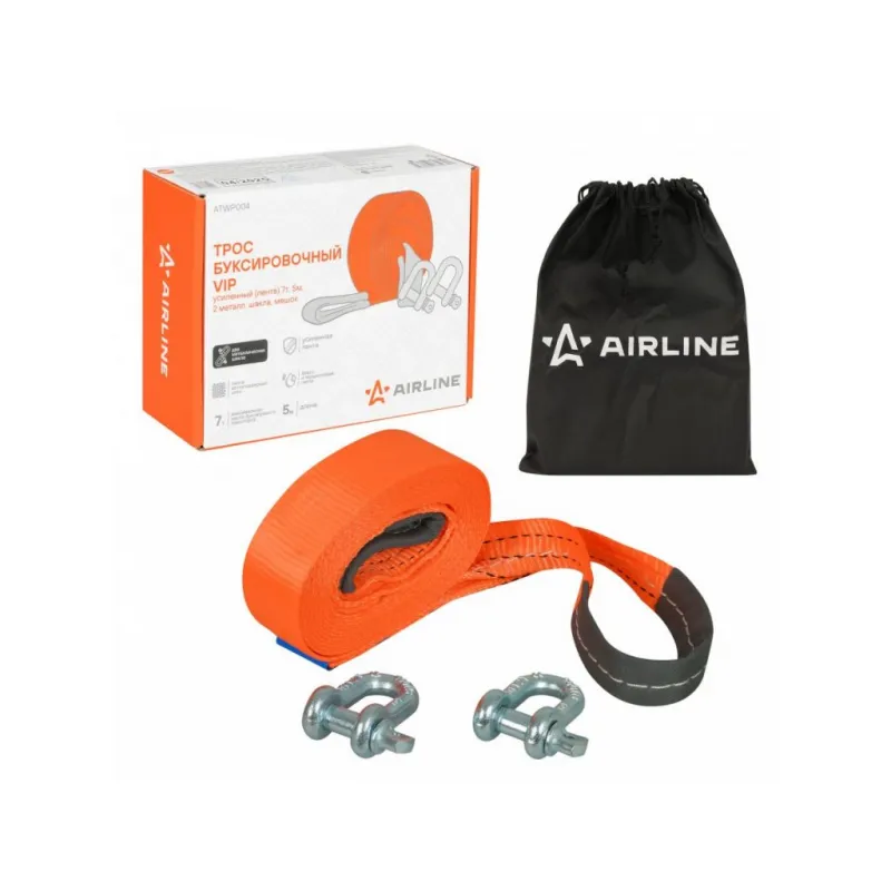 Трос VIP буксировочный усиленный (лента) 7 т, 5 м, 2 металл. шакла, с мешком Описание: Буксировочный трос AIRLINE в VIP линейке 7 тонн 5 метров с шаклами — для тех, кто ценит высший уровень надежности и долговечности при буксировке. Шаклы, использующиеся в этой модели, обеспечивают надежное и безопасное соединение с автомобилем, даже при высоких нагрузках. Трос выполнен из высококачественной полиэфирной нити, которая обладает исключительной прочностью и устойчивостью к воздействию влаги, ультрафиолетовых лучей и низких температур. В отличие от стандартных моделей, этот трос имеет более высокую разрывную нагрузку, что делает его идеальным для более интенсивных и требовательных условий эксплуатации. В комплект входит удобный мешок для хранения, который помогает компактно сложить трос и удобно разместить его в багажнике. Легко сматываемый в компактный рулон, он не занимает много места, предоставляя удобство в хранении и транспортировке. Характеристики: Артикул: ATWP004 Крепление: Металлические шаклы Ширина ленты, мм: 50 Загиб на петлю, см: 30 Длина ленты, м: 5 Материал ленты: Полиэфир Длина сшивки, см: 15 Кол-во строчек, шт: 9 Линейная плотность, г/м: 100 Нагрузка, т: 7 Тип шакла: Прямой Нагрузка на разрыв шакла, т: 8 Комплектация: Металлический шакл - 2 шт Трос буксировочный с петлями - 1 шт Мешок - 1 шт Коробка картонная - 1 шт Гарантия: от 1 года.