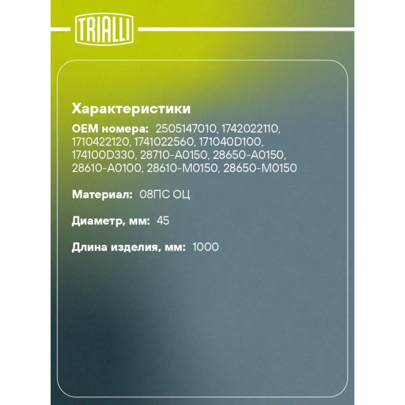 Труба глушителя прямая 45х1000 (d=45х1.5, L=1000мм) (алюминизированная сталь) Характеристики: Артикул: EMC 0145 OEM номера: 2505147010, 1742022110, 1710422120, 1741022560, 171040D100, 174100D330, 28710-A0150, 28650-A0150, 28610-A0100, 28610-M0150, 28650-M0150, 28710-M0100, 28710-M0150, 8200916974, 8200906479, 200100277R, 8200916976, 200101KA0A, 203001KA0A, 201001KA0A, 2505147070, 20010JD000, 20100JD00A, 2851026430, 286101G300, 287001G300, 287301G400, 171040D031, 1741022310, 1743022320, 174022140, 174600D050, 1742022010, 1743022120, 174101A480, 1742016720, 174301D010, 1746022010, B08A0BM701, 200105M370, 20300BM500, 20100BM520, B08A0-AU000, 20010BN805, 20300BN800, 20300BN810, 20010BN815, 203005M770, 1570A519, MR552606, MR993500, 1570A842, 1570B175, 1571A703, MN156051, 52039793, 94763377, 94763374, 20010-95F0B, 2001095F0C, 20300-95F0D, 20300-95F0C, 20300-95F0F, 20100-95F0A, 20100-95F0D, 28990-2A690, 28990-2A830, 28610-A2800, 28600-A2870, 28600-A2800, 2001000Q1A, 20010-00Q1J, 20010-00Q1K, Z6Y32050XC, Z6682050XA, Z60440300B, 1K0254505RX, 1K0254511LX, 1K0253209EN, 1K0253209J, 1K5253609, 1K0254500BX, 28610-C9100, 28650-M0100, 1K0254510X, 1K0253209BJ, 1Z3253609AE, 1K0253209CS, 1K5253609E, 1Z0253609AE, 1KO254303NX, 1F0254401FX, 1K0253209K, 28510-2B420, 285102B460, 28610-1H000, 28700-1H000, 289402A780, 28610-2L510, 28950-2A630, 28700-1H500, 1570A743, 1570B110, 1571A930, 1J0254502QX, 1J0253209, 1J5253609C, 1570B161, 1570B443, 28510-22BIH0, 28610-1H150, 28700-1H370, 28700-1H170, 357253409C Количество на автомобиль: 1 Гарантийный срок: 2 года/60 тыс. Длина изделия, мм: 1000 Материал: 08ПС ОЦ Диаметр, мм: 45 Толщина стенок: 1.5 Товарная линейка: BLACK Дополнительная информация: Этикетка изделия может отличаться от представленной на фото Комплектация: Труба прямая - 1 шт Гарантия: от 1 года.