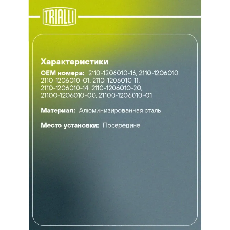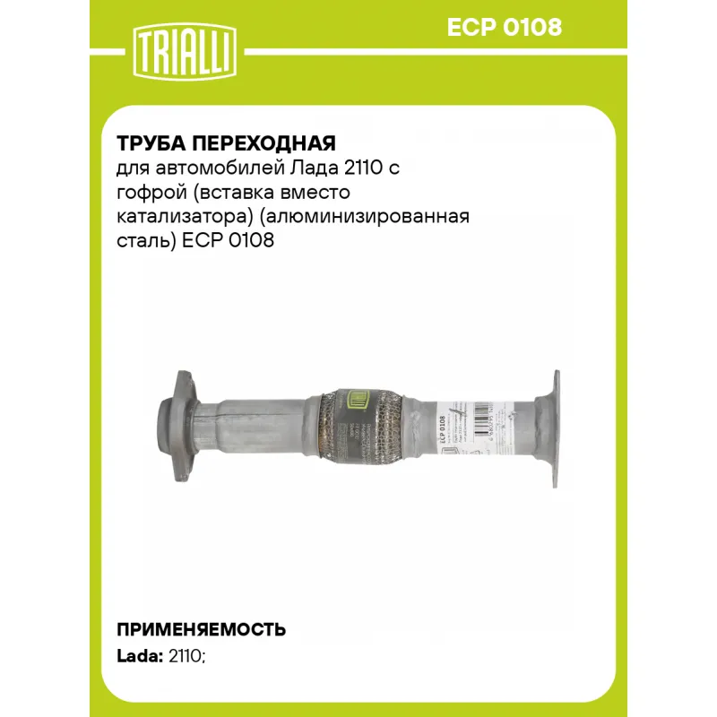 Труба переходная для автомобилей Лада 2110 с гофрой (вставка вместо катализатора) (алюминизированная сталь) Характеристики: Артикул: ECP 0108 OEM номера: 2110-1206010-16, 2110-1206010, 2110-1206010-01, 2110-1206010-11, 2110-1206010-14, 2110-1206010-20, 21100-1206010-00, 21100-1206010-01, 21100-1206010-10, 21100-1206010-11, 21100-1206010-12 Количество на автомобиль: 1 Гарантийный срок: 2 года/60 тыс. Материал: Алюминизированная сталь Длина изделия (мм): 380 Диаметр трубы (мм): 45 Место установки: посередине Товарная линейка: BLACK Дополнительная информация: Этикетка изделия может отличаться от представленной на фото Подходит для авто: ВАЗ 2110 Для проверки применяемости отправьте VIN автомобиля через вкладку "Есть вопросы о товаре?" Комплектация: Труба переходная с виброкомпенсатором - 1 шт Гарантия: от 1 года.