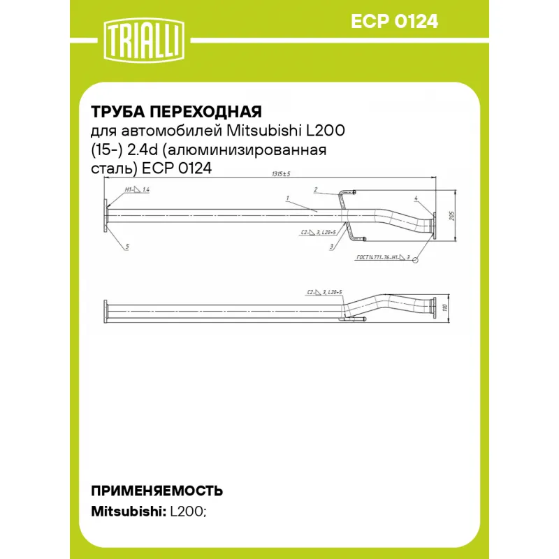 Труба переходная для автомобилей Mitsubishi L200 (15-) 2.4d (алюминизированная сталь) Характеристики: Артикул: ECP 0124 OEM номера: 1570C521 Материал: Алюминизированная сталь Место установки: посередине Гарантийный срок: 2 года/60 тыс. Сопутствующий товар: Глушители основные/глушители дополнительные (резонаторы): EMM 0523 Длина изделия (мм): 1315 Диаметр трубы (мм): 51 Количество на автомобиль: 1 Товарная линейка: BLACK Дополнительная информация: Этикетка изделия может отличаться от представленной на фото Подходит для авто: Mitsubishi L200 (06-) Для проверки применяемости отправьте VIN автомобиля через вкладку "Есть вопросы о товаре?" Комплектация: Труба переходная - 1 шт Гарантия: от 1 года.