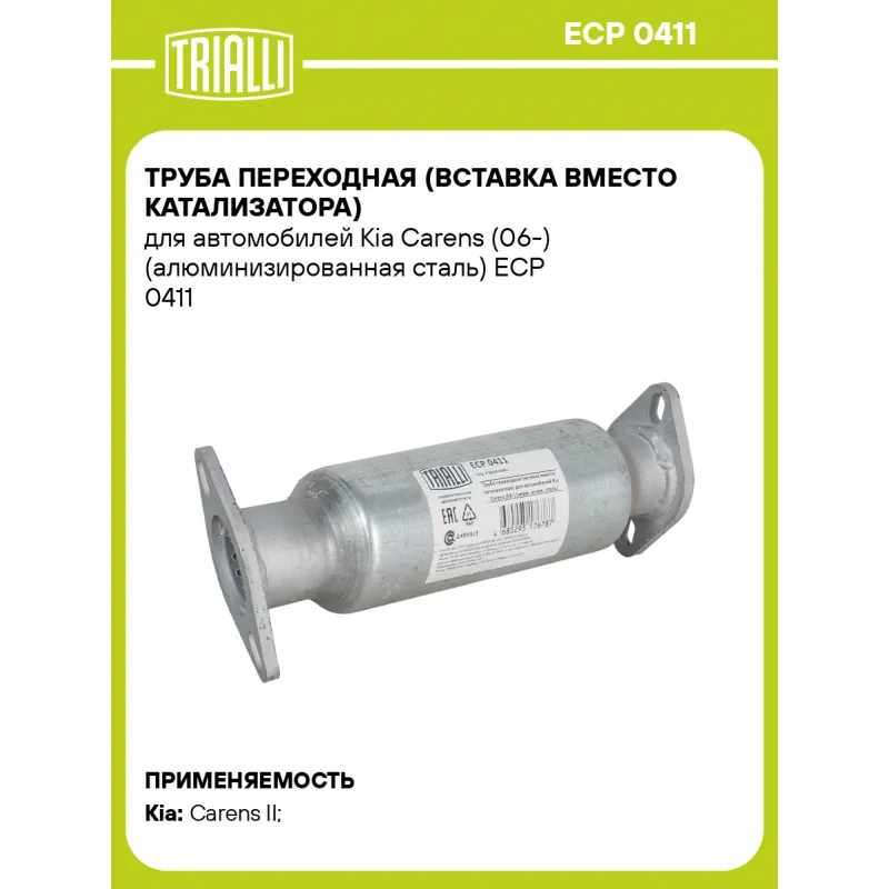 Труба переходная (вставка вместо катализатора) для автомобилей Kia Carens (06-) (алюминизированная сталь) Характеристики: Артикул: ECP 0411 OEM номера: 28950-2B951 Количество на автомобиль: 1 Гарантийный срок: 2 года/60 тыс. Материал: Алюминизированная сталь Длина изделия (мм): 335 Диаметр трубы (мм): 51 Место установки: посередине Товарная линейка: BLACK Дополнительная информация: Этикетка изделия может отличаться от представленной на фото Сопутствующий товар: Глушители основные/глушители дополнительные (резонаторы): EAM 0811 Подходит для авто: Kia Carens II (06-), Carens II (06-) Для проверки применяемости отправьте VIN автомобиля через вкладку "Есть вопросы о товаре?" Комплектация: Труба переходная - 1 шт Гарантия: от 1 года.