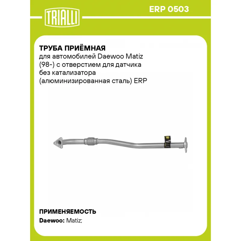 Труба приёмная для автомобилей Daewoo Matiz (98-) с отверстием для датчика без катализатора (алюминизированная сталь) Характеристики: Артикул: ERP 0503 OEM номера: 96340221, 96567437 Количество на автомобиль: 1 Гарантийный срок: 2 года/60 тыс. Материал: Алюминизированная сталь Длина изделия (мм): 1030 Диаметр трубы (мм): 43 Место установки: спереди Товарная линейка: BLACK Дополнительная информация: Этикетка изделия может отличаться от представленной на фото Сопутствующий товар: Глушители основные/глушители дополнительные (резонаторы): EAM 0502, EMM 0502 Подходит для авто: Daewoo Matiz (98-) Для проверки применяемости отправьте VIN автомобиля через вкладку "Есть вопросы о товаре?" Комплектация: Труба приемная с виброкомпенсатором - 1 шт Гарантия: от 1 года.