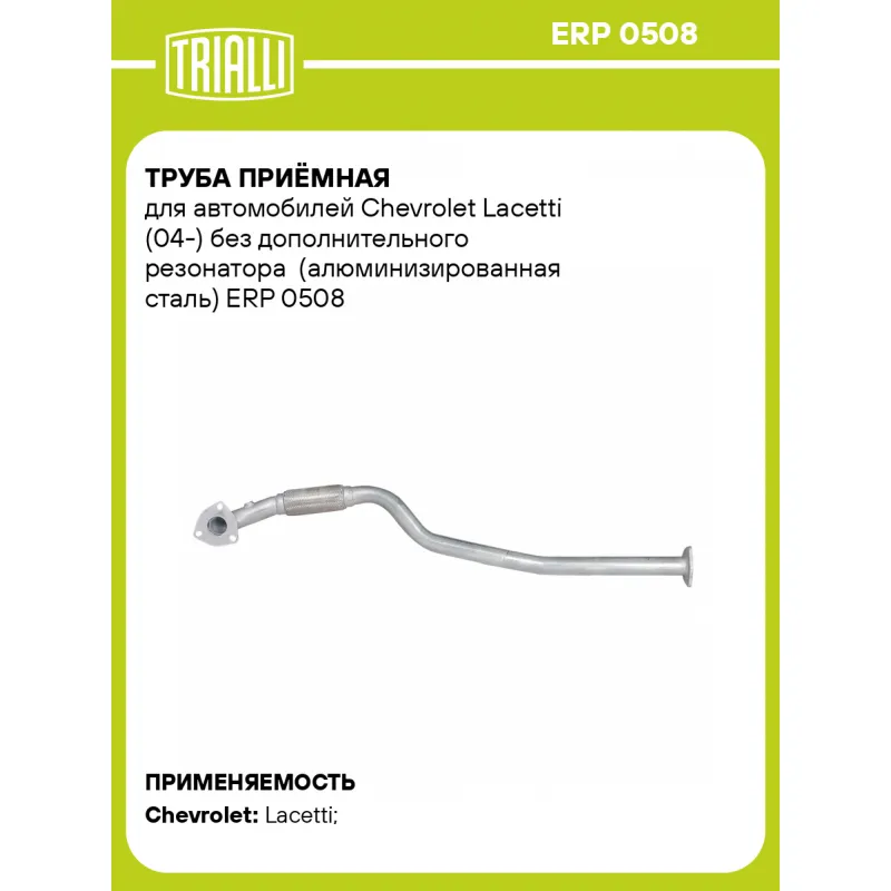 Труба приёмная для автомобилей Chevrolet Lacetti (04-) без дополнительного резонатора (алюминизированная сталь) Характеристики: Артикул: ERP 0508 OEM номера: 96490132 Количество на автомобиль: 1 Гарантийный срок: 2 года/60 тыс. Материал: Алюминизированная сталь Длина изделия (мм): 1438 Диаметр трубы (мм): 51 Место установки: спереди Товарная линейка: BLACK Дополнительная информация: Этикетка изделия может отличаться от представленной на фото Сопутствующий товар: Глушители основные/глушители дополнительные (резонаторы): EAM 0507, EMM 0508, EMM 0507 Сопутствующий товар: Трубы газоприемные: ERP 0507 Подходит для авто: Chevrolet Lacetti (04-) Для проверки применяемости отправьте VIN автомобиля через вкладку "Есть вопросы о товаре?" Комплектация: Труба приемная с виброкомпенсатором - 1 шт Гарантия: от 1 года.