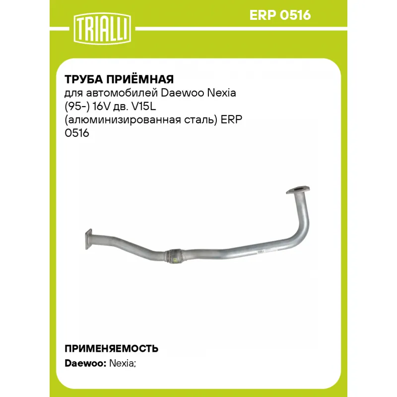 Труба приёмная для автомобилей Daewoo Nexia (95-) 16V дв. V15L (алюминизированная сталь) Характеристики: Артикул: ERP 0516 OEM номера: 96184261 Количество на автомобиль: 1 Гарантийный срок: 2 года/60 тыс. Материал: Алюминизированная сталь Длина изделия (мм): 1176 Диаметр трубы (мм): 51 Место установки: спереди Товарная линейка: BLACK Дополнительная информация: Этикетка изделия может отличаться от представленной на фото Сопутствующий товар: Глушители основные/глушители дополнительные (резонаторы): EAM 0503, EMM 0501 Сопутствующий товар: Трубы газоприемные: ERP 0502 Подходит для авто: Daewoo Nexia (94-) Для проверки применяемости отправьте VIN автомобиля через вкладку "Есть вопросы о товаре?" Комплектация: Труба приемная с виброкомпенсатором - 1 шт Гарантия: от 1 года.