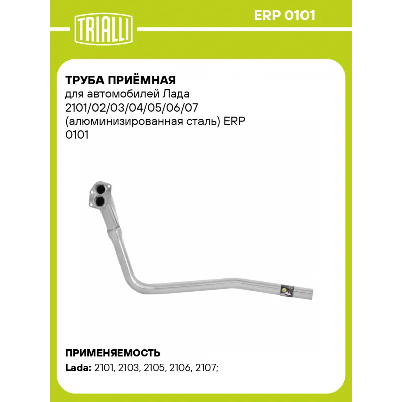 Труба приёмная для автомобилей Лада 2101/02/03/04/05/06/07 (алюминизированная сталь) Характеристики: Артикул: ERP 0101 OEM номера: 2101-1203010, 21010-1203010-00, 2101-1203010 Р-163 Количество на автомобиль: 1 Гарантийный срок: 2 года/60 тыс. Материал: Алюминизированная сталь Длина изделия (мм): 725 Диаметр трубы (мм): 43 Место установки: спереди Товарная линейка: BLACK Дополнительная информация: Этикетка изделия может отличаться от представленной на фото Сопутствующий товар: Глушители основные/глушители дополнительные (резонаторы): EAM 0104 Подходит для авто: ВАЗ 2101, 2101, 2101, 2103, 2103, 2105, 2106, 2106, 2107, 2107, 2105, 2107 Для проверки применяемости отправьте VIN автомобиля через вкладку "Есть вопросы о товаре?" Комплектация: Труба приемная - 1 шт Гарантия: от 1 года.