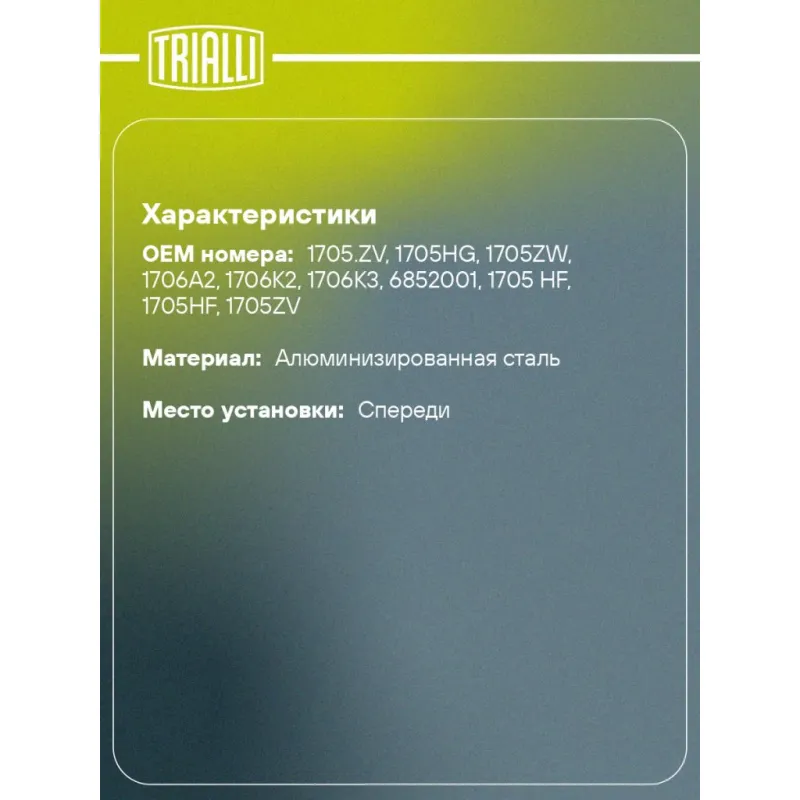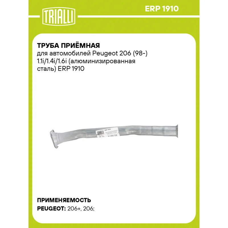 Труба приёмная для автомобилей Peugeot 206 (98-) 1.1i/1.4i/1.6i (алюминизированная сталь) Характеристики: Артикул: ERP 1910 OEM номера: 1705.ZV, 1705HG, 1705ZW, 1706A2, 1706K2, 1706K3, 6852001, 1705 HF, 1705HF, 1705ZV Гарантийный срок: 2 года/60 тыс. Количество на автомобиль: 1 Материал: Алюминизированная сталь Длина изделия (мм): 566 Диаметр трубы (мм): 43 Место установки: спереди Товарная линейка: BLACK Дополнительная информация: Этикетка изделия может отличаться от представленной на фото Сопутствующий товар: Глушители основные/глушители дополнительные (резонаторы): EMM 2006, EMM 2001 Комплектация: Труба приемная - 1 шт Гарантия: от 1 года.