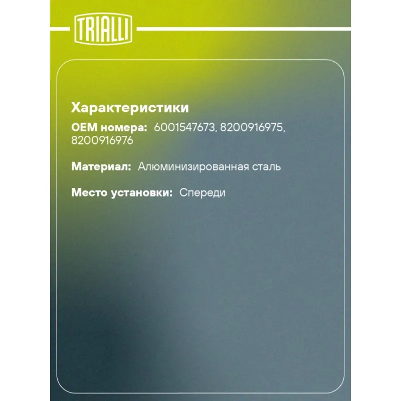 Труба приёмная для автомобилей Renault Logan (04-) (алюминизированная сталь) Характеристики: Артикул: ERP 0901 OEM номера: 6001547673, 8200916975, 8200916976 Количество на автомобиль: 1 Гарантийный срок: 2 года/60 тыс. Материал: Алюминизированная сталь Длина изделия (мм): 1197 Диаметр трубы (мм): 43 Место установки: спереди Товарная линейка: BLACK Дополнительная информация: Этикетка изделия может отличаться от представленной на фото Сопутствующий товар: Глушители основные/глушители дополнительные (резонаторы): EAM 0901, EMM 0901 Подходит для авто: Renault Logan (04-) Для проверки применяемости отправьте VIN автомобиля через вкладку "Есть вопросы о товаре?" Комплектация: Труба приемная - 1 шт Гарантия: от 1 года.