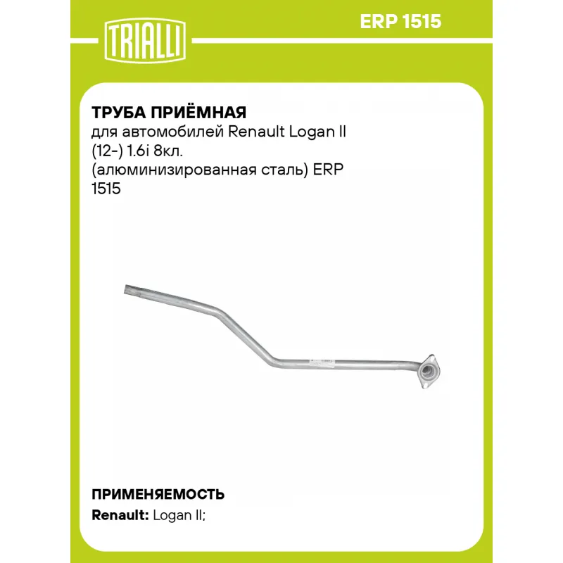 Труба приёмная для автомобилей Renault Logan ll (12-) 1.6i 8кл. (алюминизированная сталь) Характеристики: Артикул: ERP 1515 OEM номера: 200106195R, 200106175R, 200104026R, 200106874R Количество на автомобиль: 1 Гарантийный срок: 2 года/60 тыс. Материал: Алюминизированная сталь Длина изделия (мм): 1220 Диаметр трубы (мм): 38 Место установки: спереди Товарная линейка: BLACK Дополнительная информация: Этикетка изделия может отличаться от представленной на фото Сопутствующий товар: Глушители основные/глушители дополнительные (резонаторы): EAM 1515, EMM 1515 Подходит для авто: Renault Logan II (12-) Для проверки применяемости отправьте VIN автомобиля через вкладку "Есть вопросы о товаре?" Комплектация: Труба приемная - 1 шт Гарантия: от 1 года.