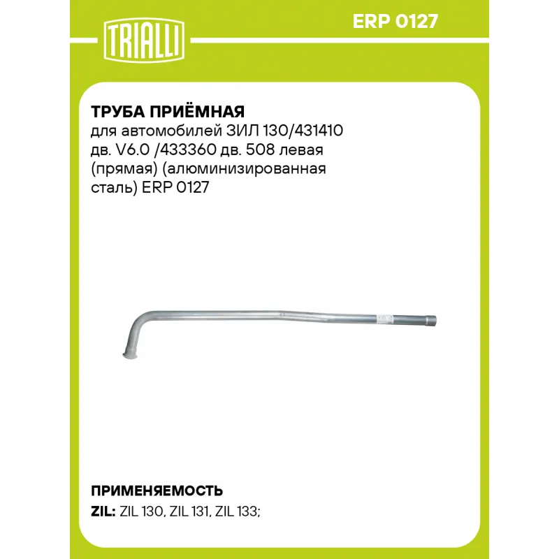 Труба приёмная для автомобилей ЗИЛ 130/431410 дв. V6.0 /433360 дв. 508 левая (прямая) (алюминизированная сталь) Характеристики: Артикул: ERP 0127 OEM номера: 130-1203011 Гарантийный срок: 2 года/60 тыс. Количество на автомобиль: 1 Материал: Алюминизированная сталь Длина изделия (мм): 1778 Диаметр трубы (мм): 57 Место установки: спереди Товарная линейка: BLACK Дополнительная информация: Этикетка изделия может отличаться от представленной на фото Сопутствующий товар: Глушители основные/глушители дополнительные (резонаторы): EMM 0343, ERP 0128 Комплектация: Труба приемная - 1 шт Гарантия: от 1 года.