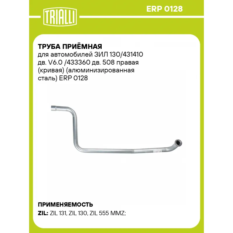Труба приёмная для автомобилей ЗИЛ 130/431410 дв. V6.0 /433360 дв. 508 правая (кривая) (алюминизированная сталь) Характеристики: Артикул: ERP 0128 OEM номера: 130-1203010 Гарантийный срок: 2 года/60 тыс. Количество на автомобиль: 1 Материал: Алюминизированная сталь Длина изделия (мм): 1495 Диаметр трубы (мм): 57 Место установки: спереди Товарная линейка: BLACK Дополнительная информация: Этикетка изделия может отличаться от представленной на фото Сопутствующий товар: Глушители основные/глушители дополнительные (резонаторы): EMM 0343, ERP 0127 Комплектация: Труба приемная - 1 шт Гарантия: от 1 года.