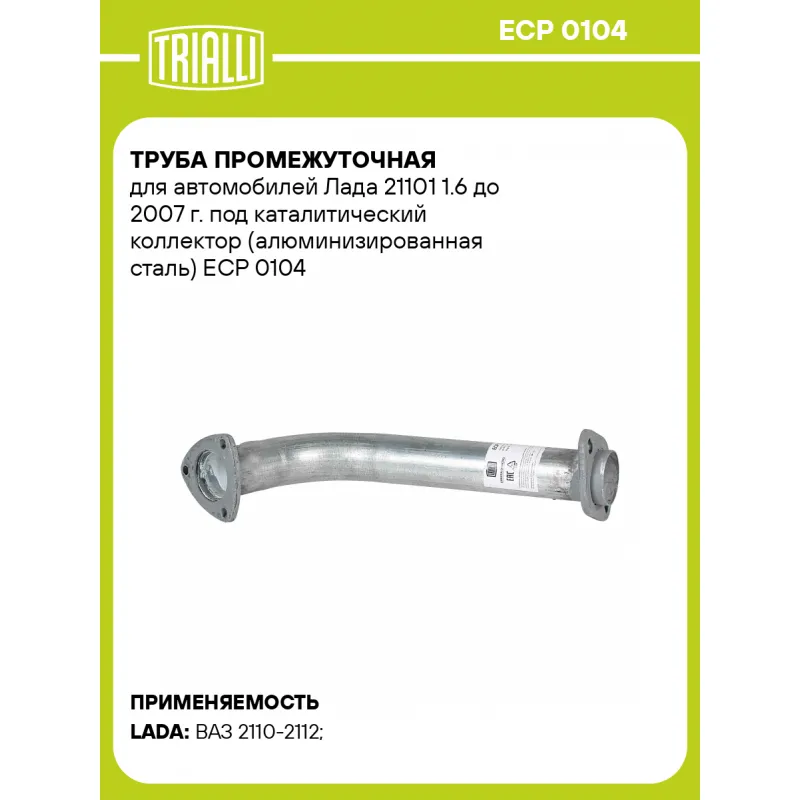Труба промежуточная для автомобилей Лада 21101 1.6 до 2007 г. под каталитический коллектор (алюминизированная сталь) Характеристики: Артикул: ECP 0104 OEM номера: 21101-1203033 Количество на автомобиль: 1 Гарантийный срок: 2 года/60 тыс. Материал: Алюминизированная сталь Длина изделия (мм): 400 Диаметр трубы (мм): 51 Место установки: посередине Товарная линейка: BLACK Дополнительная информация: Этикетка изделия может отличаться от представленной на фото Комплектация: Труба промежуточная - 1 шт Гарантия: от 1 года.