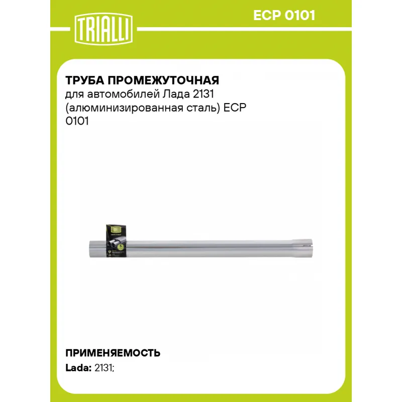 Труба промежуточная для автомобилей Лада 2131 (алюминизированная сталь) Характеристики: Артикул: ECP 0101 OEM номера: 2129-1203034 Количество на автомобиль: 1 Гарантийный срок: 2 года/60 тыс. Материал: Алюминизированная сталь Длина изделия (мм): 560 Диаметр трубы (мм): 43 Место установки: посередине Товарная линейка: BLACK Дополнительная информация: Этикетка изделия может отличаться от представленной на фото Сопутствующий товар: Глушители основные/глушители дополнительные (резонаторы): EAM 0346 Подходит для авто: ВАЗ 2131 Для проверки применяемости отправьте VIN автомобиля через вкладку "Есть вопросы о товаре?" Комплектация: Труба промежуточная - 1 шт Гарантия: от 1 года.