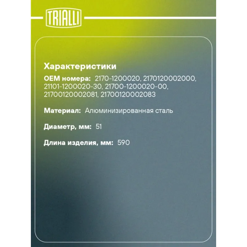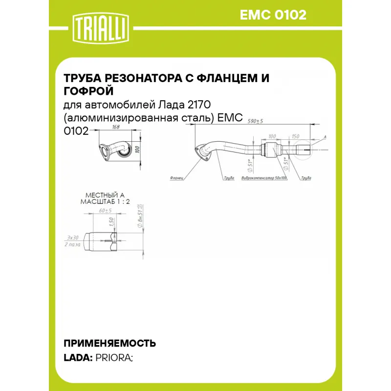 Труба резонатора с фланцем и гофрой для автомобилей Лада 2170 (алюминизированная сталь) Характеристики: Артикул: EMC 0102 OEM номера: 2170-1200020, 2170120002000, 21101-1200020-30, 21700-1200020-00, 21700120002081, 21700120002083 Материал: Алюминизированная сталь Диаметр, мм: 51 Гарантийный срок: 2 года/60 тыс. Толщина стенок: 1,2 Длина изделия, мм: 590 Количество на автомобиль: 1 Товарная линейка: BLACK Дополнительная информация: Этикетка изделия может отличаться от представленной на фото Комплектация: Фланец с трубой - 1 шт Виброкомпенсатор выхлопной трубы - 1 шт Гарантия: от 1 года.