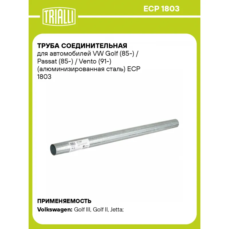 Труба соединительная для автомобилей VW Golf (85-) / Passat (85-) / Vento (91-) (алюминизированная сталь) Характеристики: Артикул: ECP 1803 OEM номера: 1H0253203E, 191253203E, 1H0253203A, 1H0253203K Количество на автомобиль: 1 Гарантийный срок: 2 года/60 тыс. Материал: Алюминизированная сталь Длина изделия (мм): 795 Диаметр трубы (мм): 51 Место установки: посередине Товарная линейка: BLACK Дополнительная информация: Этикетка изделия может отличаться от представленной на фото Сопутствующий товар: Глушители основные/глушители дополнительные (резонаторы): EAM 1806, EMM 1801, EMM 1803 Подходит для авто: Volkswagen Golf III (91-), Golf II (83-), Jetta (84-), Vento (92-) Для проверки применяемости отправьте VIN автомобиля через вкладку "Есть вопросы о товаре?" Комплектация: Труба соединительная - 1 шт Гарантия: от 1 года.