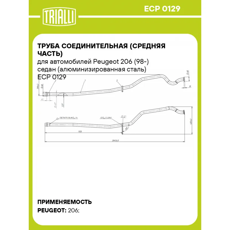 Труба соединительная (средняя часть) для автомобилей Peugeot 206 (98-) седан (алюминизированная сталь) Характеристики: Артикул: ECP 0129 OEM номера: 1717-HE Материал: Алюминизированная сталь Место установки: посередине Гарантийный срок: 2 года/60 тыс. Сопутствующий товар: Глушители основные/глушители дополнительные (резонаторы):... Читать полностью →