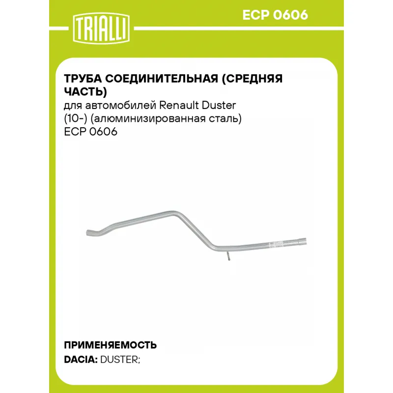 Труба соединительная (средняя часть) для автомобилей Renault Duster (10-) (алюминизированная сталь) Характеристики: Артикул: ECP 0606 OEM номера: 200107067R Количество на автомобиль: 1 Гарантийный срок: 2 года/60 тыс. Материал: Алюминизированная сталь Длина изделия (мм): 1525 Диаметр трубы (мм): 43 Место установки: посередине Товарная линейка: BLACK Дополнительная информация: Этикетка изделия может отличаться от представленной на фото Комплектация: Труба соединительная - 1 шт Гарантия: от 1 года.