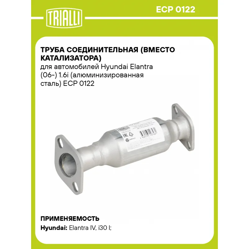 Труба соединительная (вместо катализатора) для автомобилей Hyundai Elantra (06-) 1.6i (алюминизированная сталь) Характеристики: Артикул: ECP 0122 OEM номера: 285102E365 Гарантийный срок: 2 года/60 тыс. Количество на автомобиль: 1 Материал: Алюминизированная сталь Длина изделия (мм): 310 Диаметр трубы (мм): 51 Место установки: посередине Товарная линейка: BLACK Дополнительная информация: Этикетка изделия может отличаться от представленной на фото Сопутствующий товар: Глушители основные/глушители дополнительные (резонаторы): EAM 0379 Подходит для авто: Hyundai Elantra IV (06-), i30 I (07-) Для проверки применяемости отправьте VIN автомобиля через вкладку "Есть вопросы о товаре?" Комплектация: Труба соединительная - 1 шт Гарантия: от 1 года.