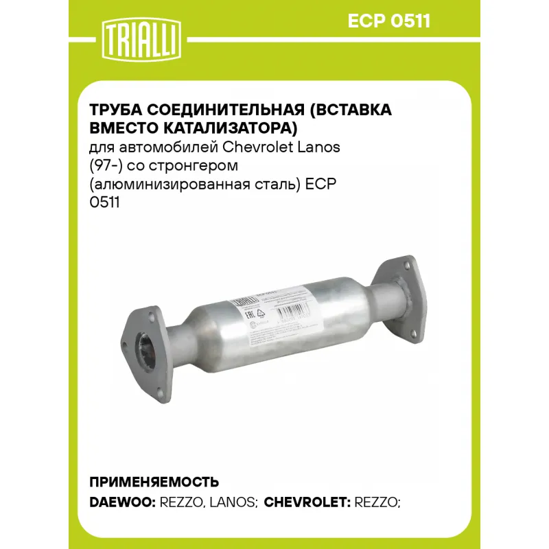 Труба соединительная (вставка вместо катализатора) для автомобилей Chevrolet Lanos (97-) со стронгером (алюминизированная сталь) Характеристики: Артикул: ECP 0511 OEM номера: 96351601 Количество на автомобиль: 1 Гарантийный срок: 2 года/60 тыс. Материал: Алюминизированная сталь Длина изделия (мм): 350 Диаметр трубы (мм): 45 Место установки: посередине Товарная линейка: BLACK Дополнительная информация: Этикетка изделия может отличаться от представленной на фото Сопутствующий товар: Глушители основные/глушители дополнительные (резонаторы): EMM 0506, EAM 0504, EAM 0210 Сопутствующий товар: Трубы газоприемные: ECP 0501; ERP 0504; ERP 0505; ERP 0506; ERP 0509 Комплектация: Труба соединительная (вставка вместо кат-ра) - 1 шт Гарантия: от 1 года.