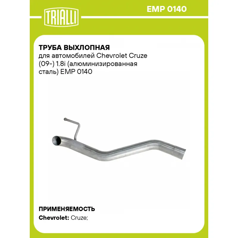 Труба выхлопная для автомобилей Chevrolet Cruze (09-) 1.8i (алюминизированная сталь) Характеристики: Артикул: EMP 0140 OEM номера: 13317222, 13319638 Количество на автомобиль: 1 Гарантийный срок: 2 года/60 тыс. Материал: Алюминизированная сталь Длина изделия (мм): 670 Диаметр трубы (мм): 51 Место установки: сзади Товарная линейка: BLACK Дополнительная информация: Этикетка изделия может отличаться от представленной на фото Подходит для авто: Chevrolet Cruze (09-) Для проверки применяемости отправьте VIN автомобиля через вкладку "Есть вопросы о товаре?" Комплектация: Труба выхлопная - 1 шт Гарантия: от 1 года.