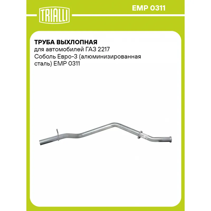 Труба выхлопная для автомобилей ГАЗ 2217 Соболь Евро-3 (алюминизированная сталь) Характеристики: Артикул: EMP 0311 OEM номера: 2310-1203170-40 Количество на автомобиль: 1 Гарантийный срок: 2 года/60 тыс. Материал: Алюминизированная сталь Длина изделия (мм): 1510 Диаметр трубы (мм): 63,5 Место установки: сзади Товарная линейка: BLACK Дополнительная информация: Этикетка изделия может отличаться от представленной на фото Сопутствующий товар: Глушители основные/глушители дополнительные (резонаторы): EMM 0365, EMM 0380, EMM 0312 Комплектация: Труба выхлопная - 1 шт Гарантия: от 1 года.