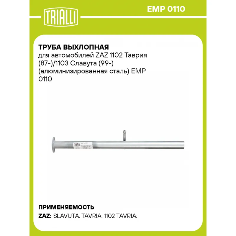 Труба выхлопная для автомобилей ZAZ 1102 Таврия (87-)/1103 Славута (99-) (алюминизированная сталь) Характеристики: Артикул: EMP 0110 OEM номера: 110550-1201075 Материал: Алюминизированная сталь Место установки: сзади Гарантийный срок: 2 года/60 тыс. Длина изделия (мм): 670 Диаметр трубы (мм): 40 Количество на автомобиль: 1 Товарная линейка: BLACK Дополнительная информация: Этикетка изделия может отличаться от представленной на фото Комплектация: Труба выхлопная - 1 шт Гарантия: от 1 года.