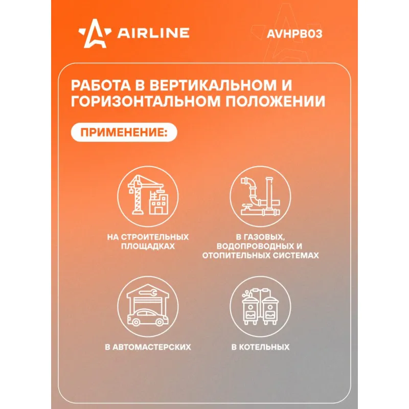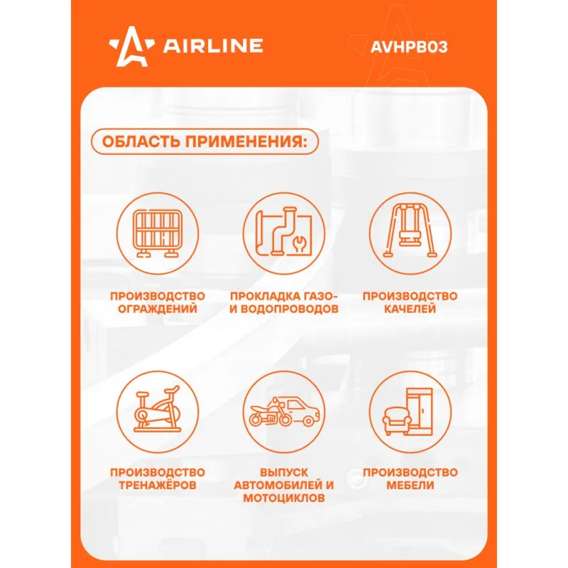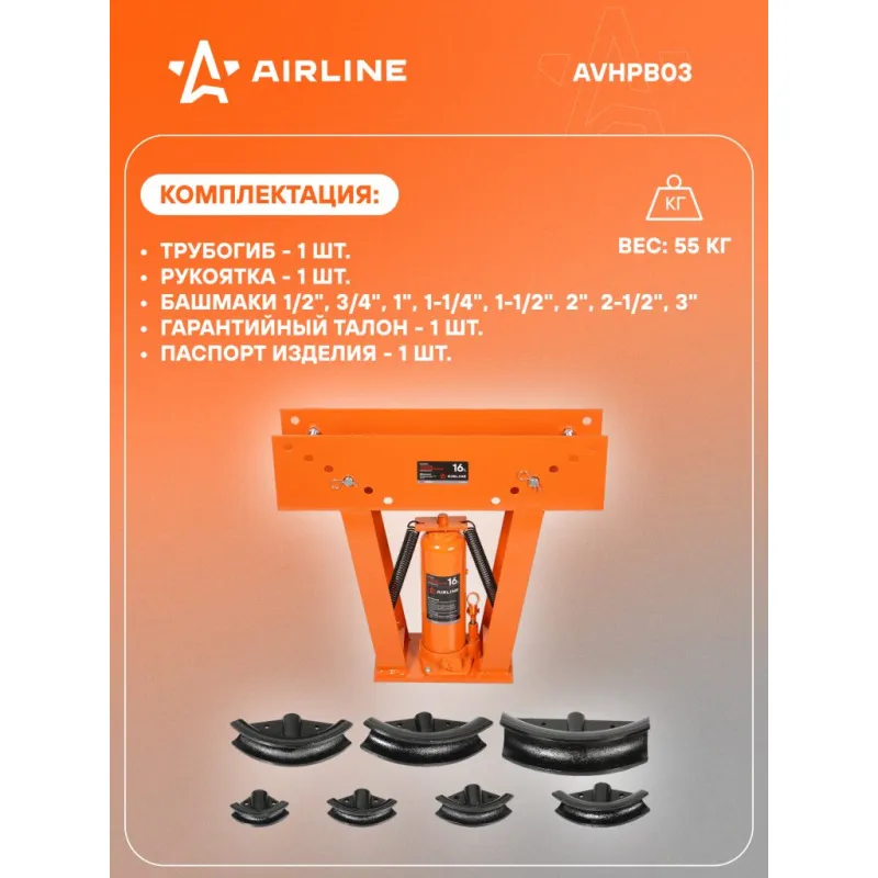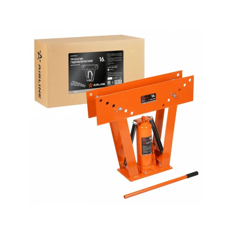 Трубогиб гидравлический 16т, вертикальный, башмаки 8шт. 1/2-3" Описание: AIRLINE Трубогиб 16 т ручной, гидравлический, вертикальный + 8 насадок AVHPB03 Мощность поршня составляет 16 т. Гидравлический трубогиб / профилегиб от бренда AIRLINE AVHPB03 - строительный профессиональный инструмент, предназначен гибки металлических труб разного диаметра. Конструкция трубогиба выполнена из высокопрочной стали, что позволяет ему быть износостойким при эксплуатации. Данная модель не требует от пользователя больших усилий, так как инструмент имеет гидравлический привод. Особенности: - Прочная конструкция. Материалы: сталь, чугун; - Может осуществлять работу в вертикальном и горизонтальном положении. - В комплекте идут насадки / башмаки следующих размеров:1/2", 3/4", 1", 1-1/4", 1-1/2", 2", 2-1/2", 3". - Заводское производство и гарантия от производителя 1 год. ОБЛАСТЬ ПРИМЕНЕНИЯ: - производство ограждений; - прокладка газо- и водопроводов; - производство качелей; - производство тренажёров; - производство мебели; - выпуск автомобилей и мотоциклов; - трубогиб для профильной трубы / для профиля. Универсальный трубогиб нашел свое применение на строительных площадках, в газовых, водопроводных и отопительных системах, автомастерских, в котельных, на территории предприятий, на СТО. Характеристики: Артикул: AVHPB03 Усилие, т: 16 Ход штока, мм: 250 Комплектация: Трубогиб - 1 шт Рукоятка - 1 шт Башмак 1/2" - 1 шт Башмак 3/4" - 1 шт Башмак 1" - 1 шт Башмак 1-1/4" - 1 шт Башмак 1-1/2" - 1 шт Башмак 2" - 1 шт Башмак 2-1/2" - 1 шт Башмак 3" - 1 шт Гарантийный талон - 1 шт Паспорт изделия - 1 шт Коробка - 1 шт Гарантия: от 1 года.